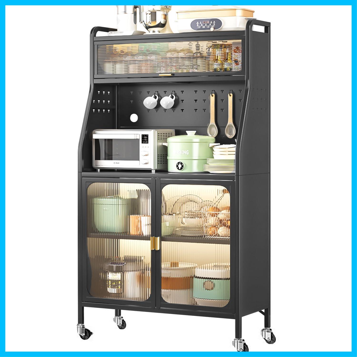 【特価セール】食器棚 家電収納 家電ラック 5段 キッチンラック キャスター&調整脚付き フック付き 電子レンジ 炊飯器 透明ドア 防塵 スライドドア キッチン作業台 ブラック 幅86×奥行36×高さ161.5cm