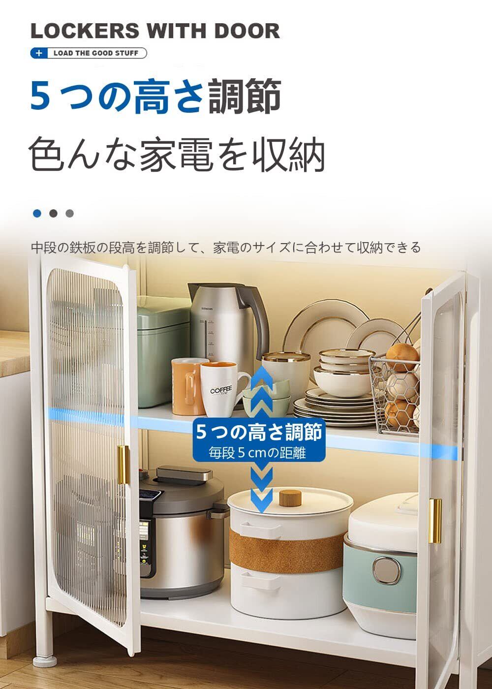 【行き届くデザイン】①食器棚の脚は2種類もあり、360°回転できるキャスターと高さ微調整脚を場合によってお使いいただけます。調整脚は組み立てができて揺れを感じたら、4つの脚とも回して高さを微調整して、4つの脚を全部地面にピッタリ立てば、たとえ平たいでない地面でも揺れなく使用できます。②食器棚の股下は地面までの距離は12cmほどあるので、下の空間が掃除しやすく、ロボット掃除機でも下の空間に入れて便利に掃除できます。③食器棚は全体はスナップ式で構成していて、ネジ一本も使わずので、組み立てがより早く、より手間や労力を省くことができ、説明書に従って、女の子でも簡単に組み立てられます。