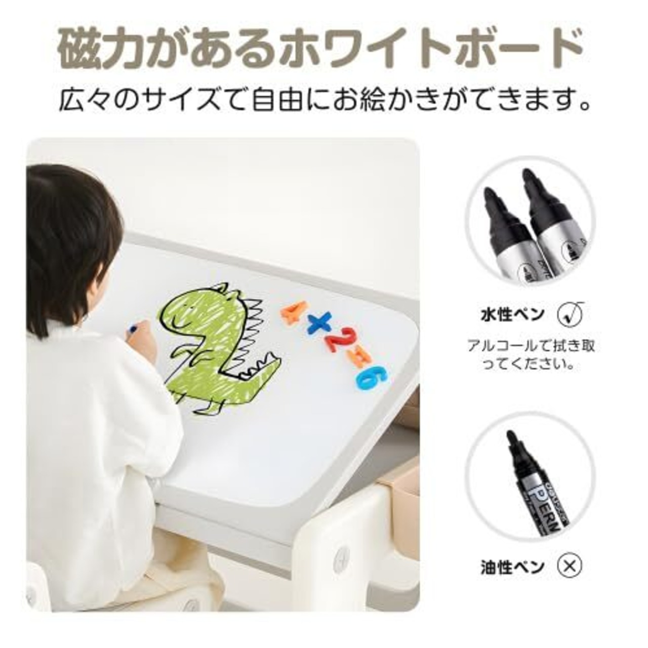 ホワイトボード天板:テーブルの天板はホワイトボード仕様になっており、自由にお絵かきや文字を書くことができます。何度も消して書き直せるため、創造力を育むのに最適です。