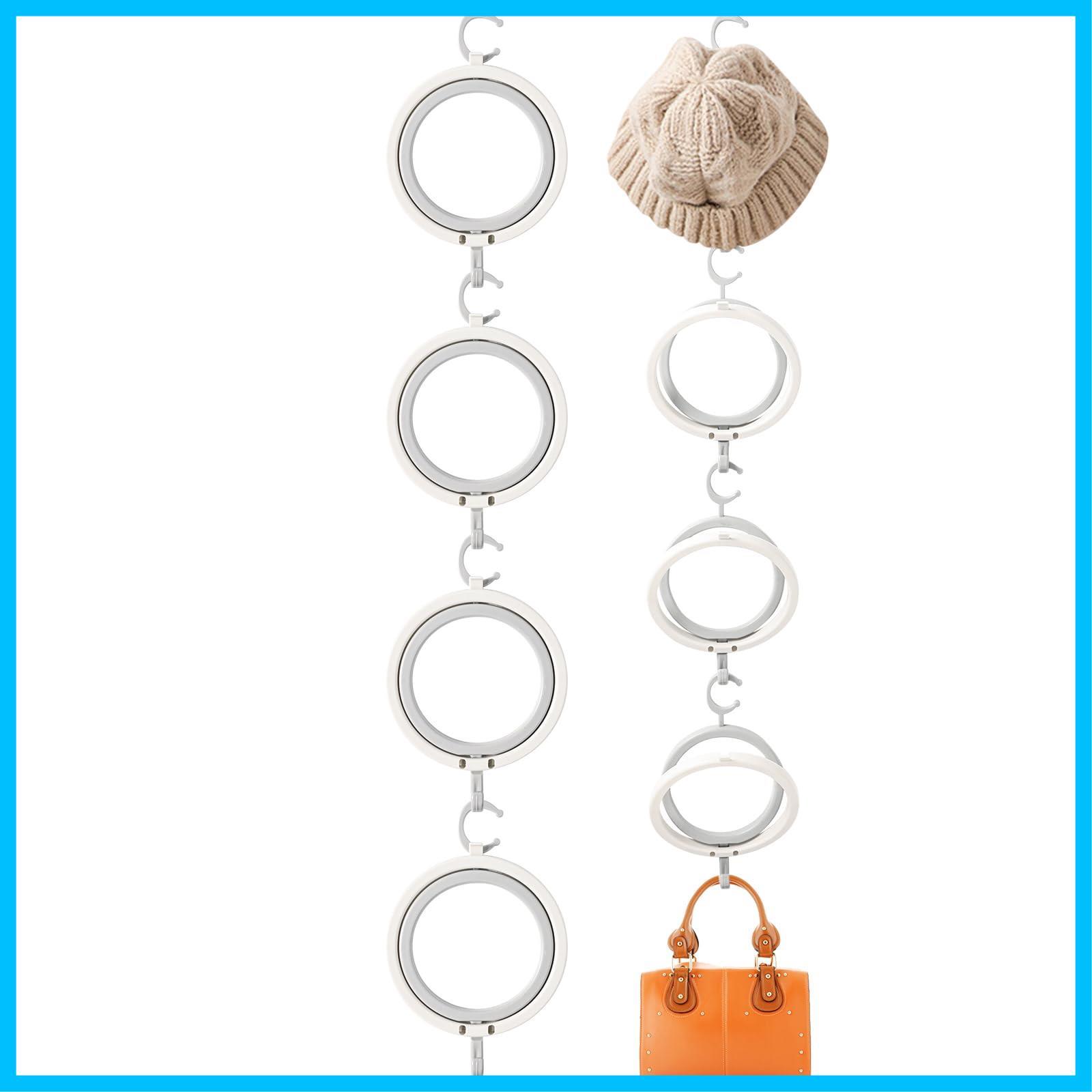 【使いやすい】リングの上のフックを、上のリングの下側にフックに引っ掛けるだけです。一番下に掛けたリングの下側のフックも使えます。輪っかのパーツは1個づつ別々の袋に入っており、それぞれの袋に1個、テープで壁などに貼れる粘着テープの付いたフックがついていました。こちらの商品と組み合わせなくてもこれ単独で使えます。