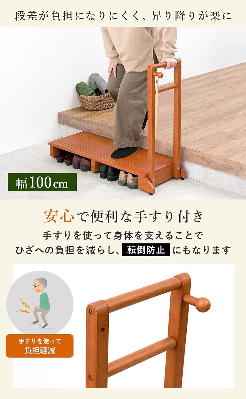 萩原(Hagihara) 玄関踏み台 玄関台 手すり付き踏み台 手すり台 ワイド 【安心の耐荷重100kg】 ひざ 腰 負担軽減 子供 高齢者 ペット 幅100 ライトブラウン VH-7934LBR-W
