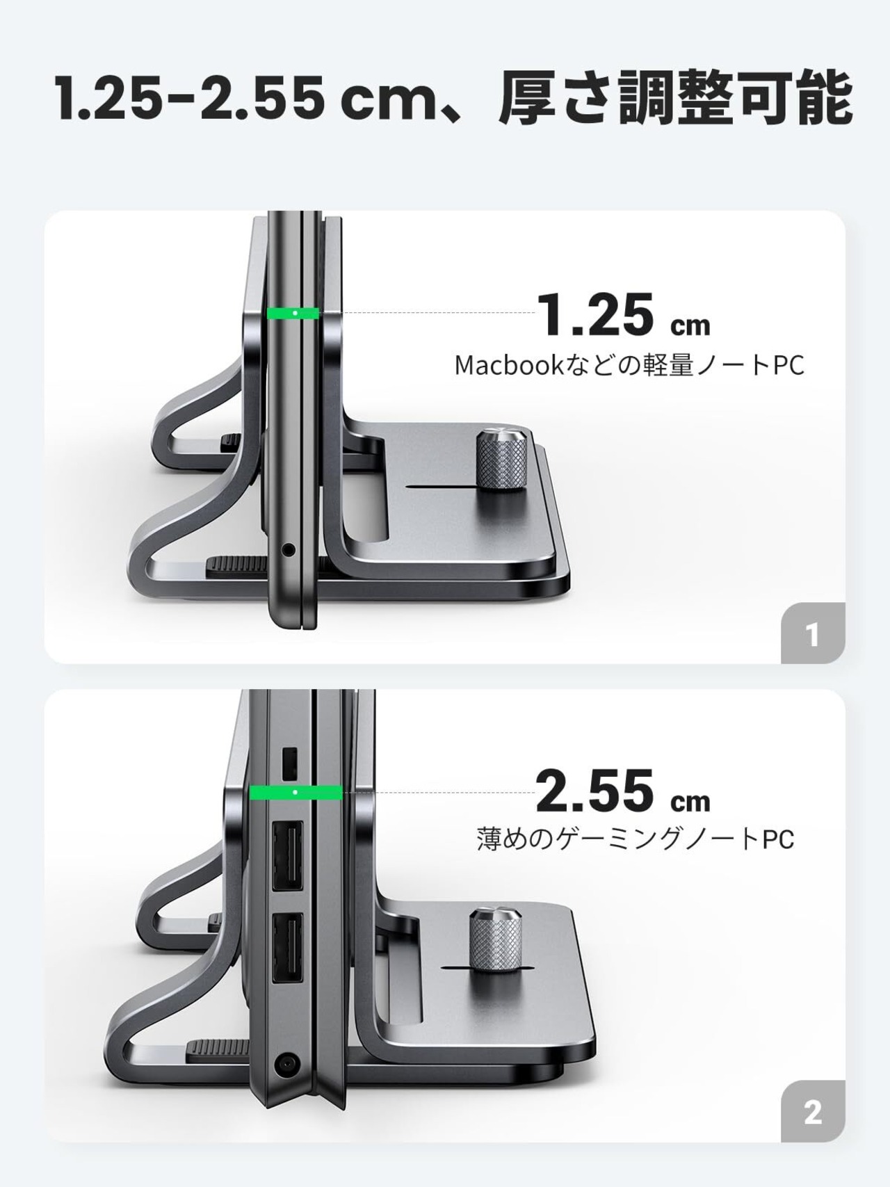 【調整可能なスロット】ノートパソコンホルダースタンドは、厚さ0.5インチから最大1インチのノートパソコンにフィットします。 ネジをひねることで簡単にスロットを拡張でき、工具が不要です。