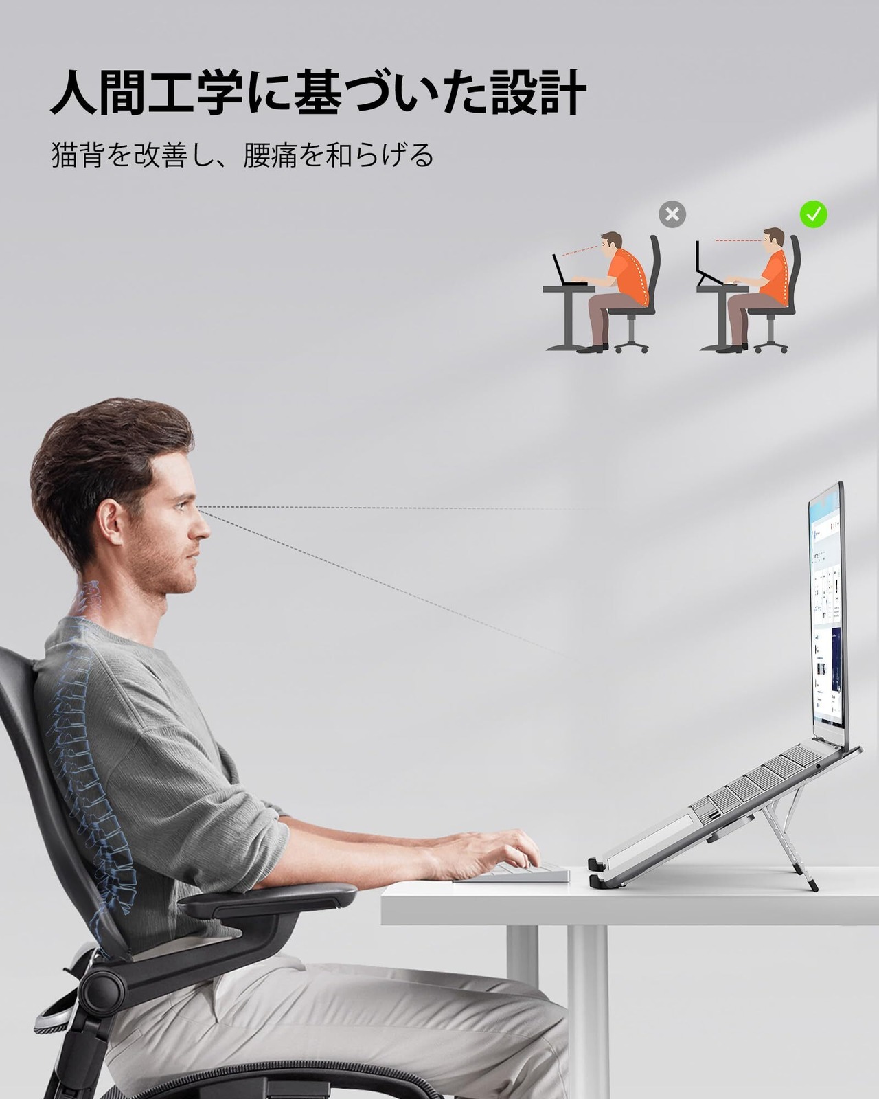 【革新的・スプリング式】従来のPCスタンドとは異なり、調整アームはスプリング設計を採用しています。1秒で最適な視点に固定でき、グラグラすることもありません。また、さまざまな角度のニーズを満たすために6段階の高さ調整できます。人間工学に基づいた設計で、目線が上に向いて、肩が肘が楽になります。腰痛や猫背のやわらかにも役立ちます。