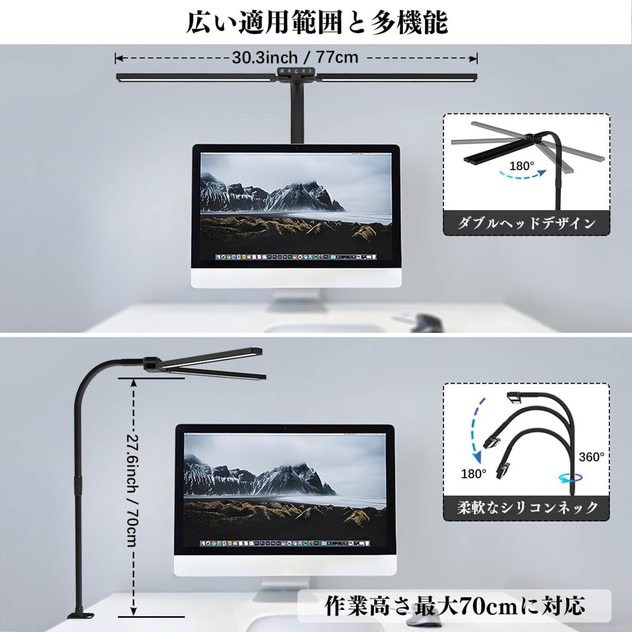 ✨【デスク全体を照らす】この24Wクランプ式LEDデスクライトは、77cmの超幅広デュアルライトバーを装備し、最大作業高さ77cm、228個のLEDライトビーズを内蔵、最大輝度1800LMを実現しています。大型デスクでの作業、勉強、モニター、絵画、読書、ゲームなどに最適です。