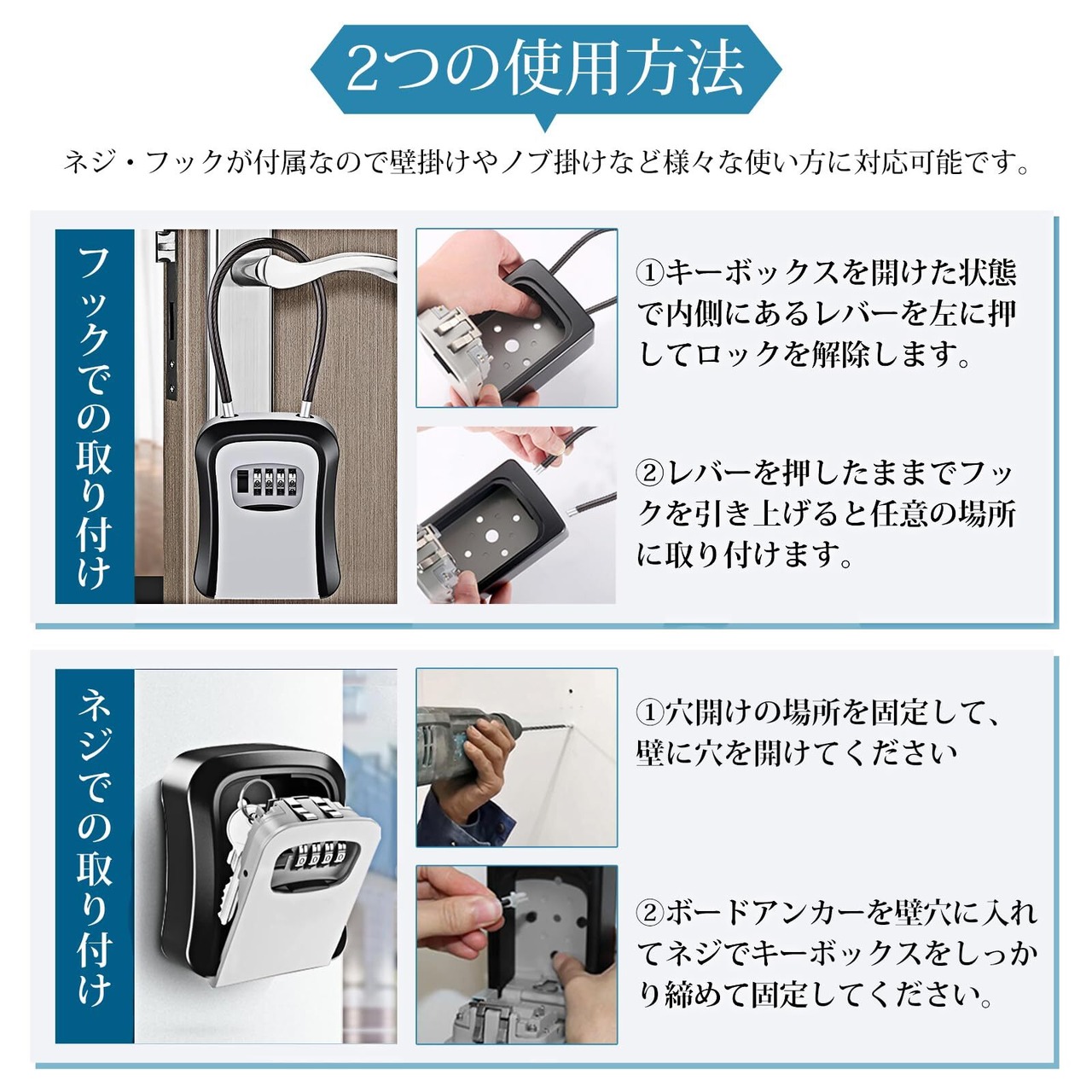 ✨【多様な使用方法】このキーボックスは壁や他の硬い表面に取り付けることができます。梱包にはすべての取り付けアクセサリーが含まれており、4つのネジを使用してキー収納ボックスを壁に固定するだけです。また、取り外し可能なラッチが付いているので、ドアの取っ手や玄関など、お好きな場所に掛けることができます。