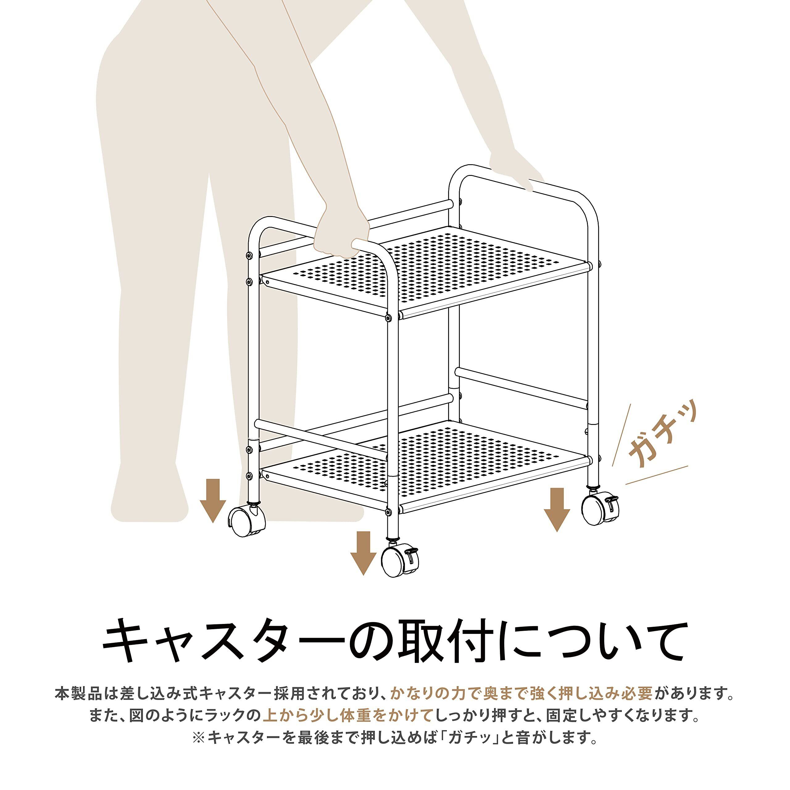【移動・固定ラクラク】前2個キャスターにはストッパー付きで、ラックが固定し設置出来ます。ハンドルもあるので、移動がラクラクで様々な場所でも使いやすいです。また、床からラックの下段まで約5CM高さがあり、掃除が便利です。