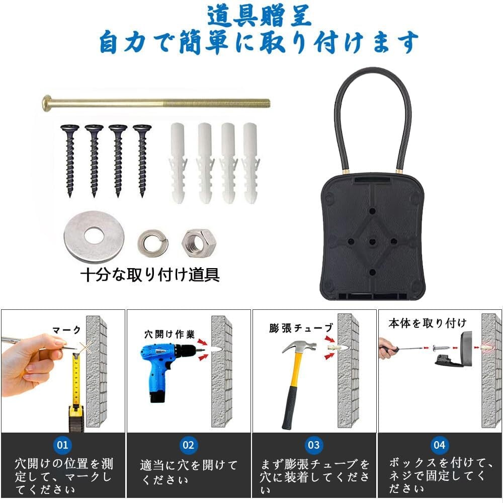 【ワイヤー式+壁掛け式】キーボックス上部のワイヤーは完全に取り外して分離できる設計を採用します。長さ約26cmのワイヤーは丈夫で柔軟性もあります。取っ手、窓、自転車などに掛けて、簡単に固定できます。また、ネジ止めで本体を壁に取り付けることができます。取り付けの専用道具を贈呈していますので、自力で簡単に取り付けられます。