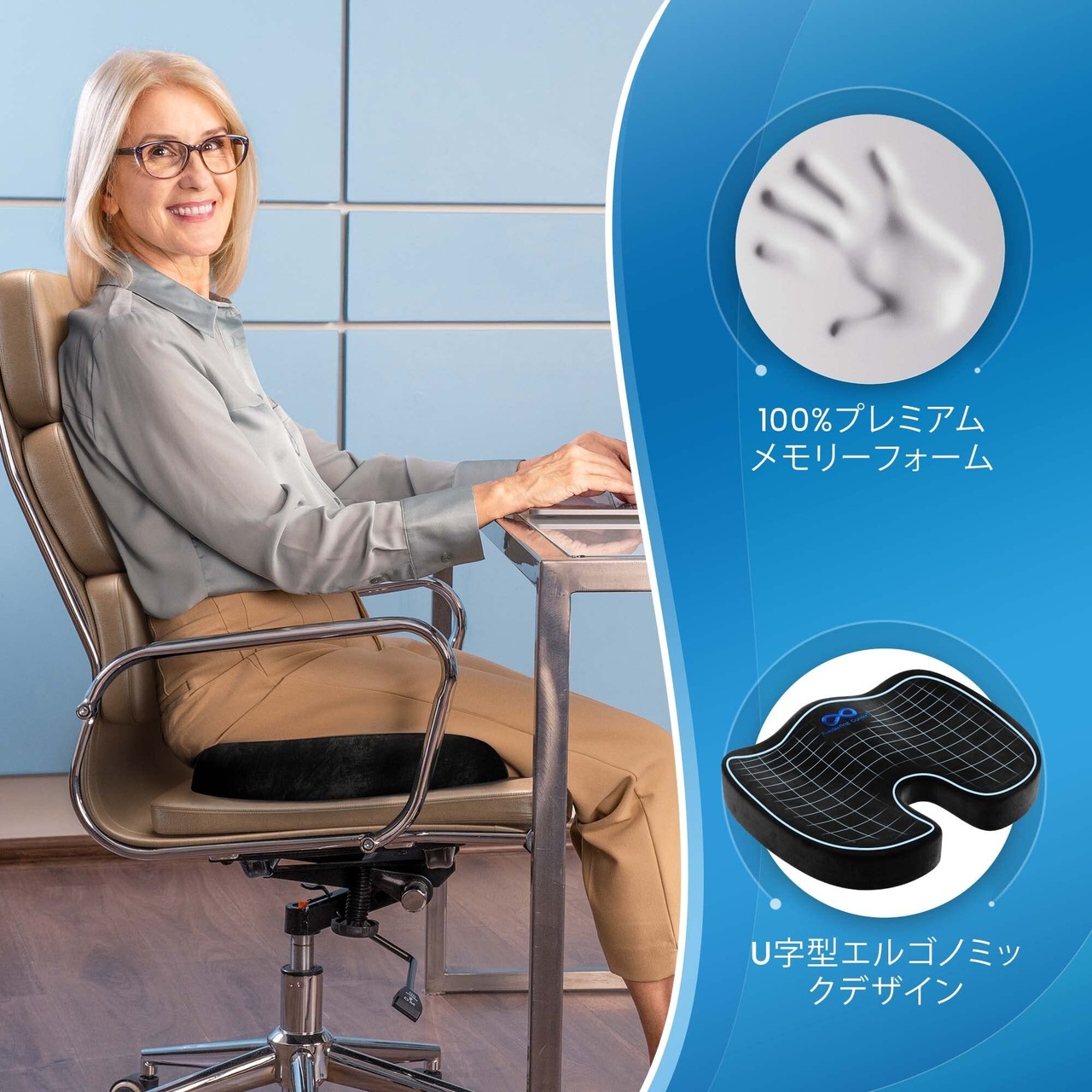 骨盤矯正クッションで姿勢サポート – 人間工学設計に基づいたU字型デザインが、骨盤を正しい位置に導き、腰や尾てい骨への負担を軽減。長時間の使用でも快適。