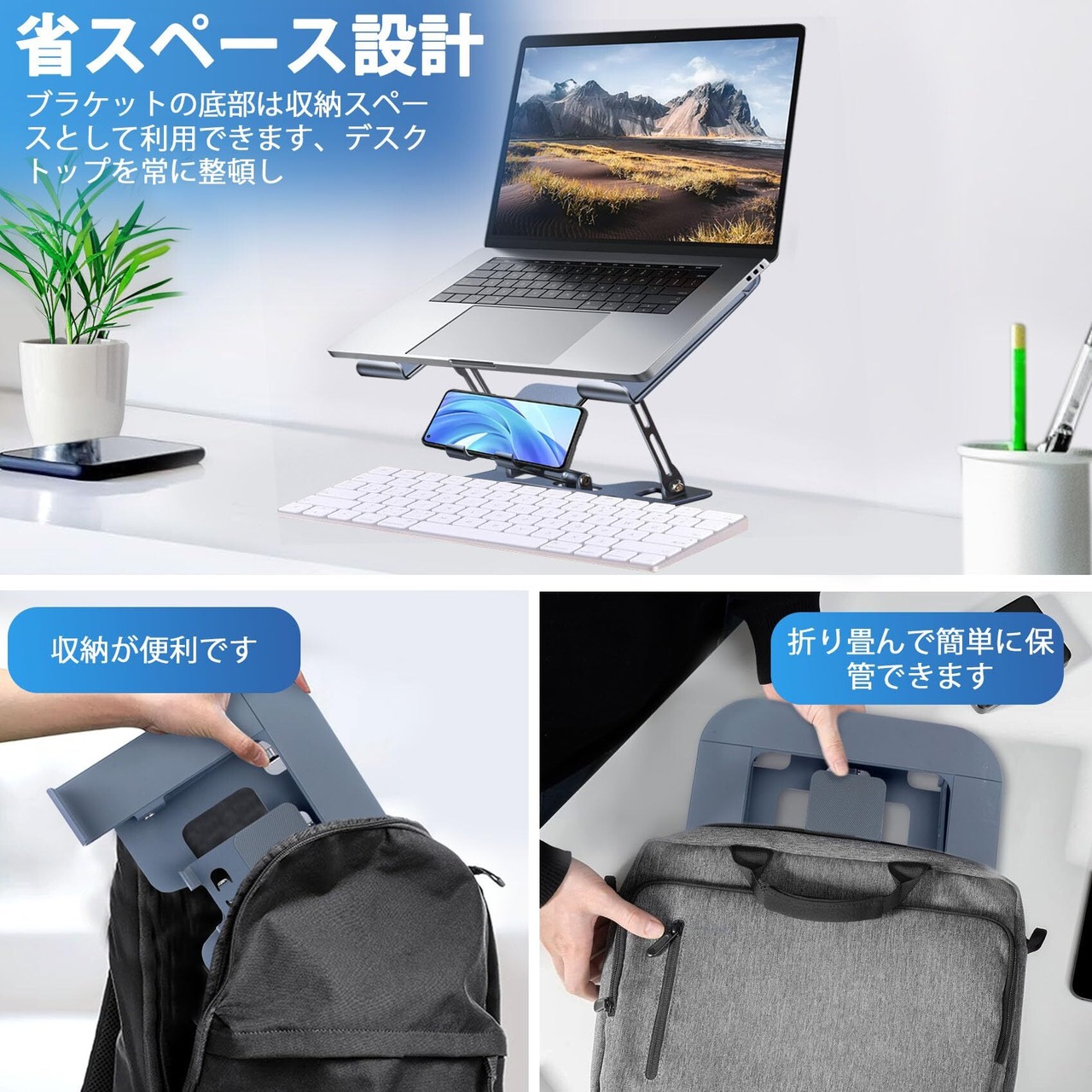 【携帯に便利&省スペースです】当社のラップトップスタンドは軽量で折りたたみ可能です、持ち運びや収納が簡単で。オフィス、自宅、外出先など、さまざまなシーンで活躍します。底部スペースキーボードや文房具の収納にも利用可能で、作業エリアを整頓し、使用スペースの効率を向上させます。お客様の気持ちは弊社にとってとても大切です、何かご質問がございましたら、いつでもご連絡ください。私たちは最善のサービスを提供するために最善を尽くします、一年間の保証期をお約束致します。