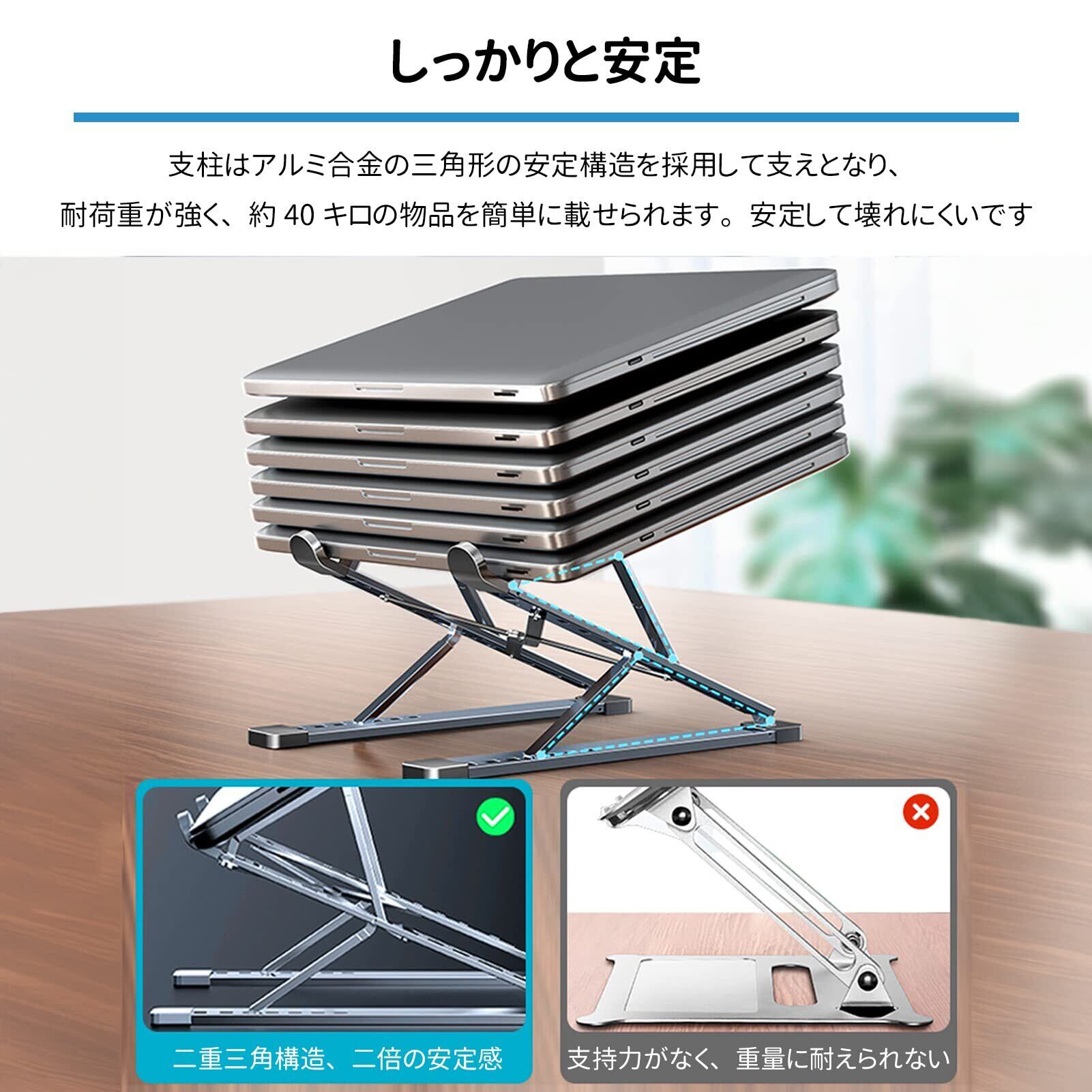 【全アルミ合金製・高耐久性】PCスタンドは、アルミ合金の三角形の安定構造を支えとして採用し、強力な耐荷重力を持ち、最大40kgの物品を載せても傾きにくく、耐久性に優れています。キーボードを叩いたり、ゲームを楽しんだりするときも、揺れません。