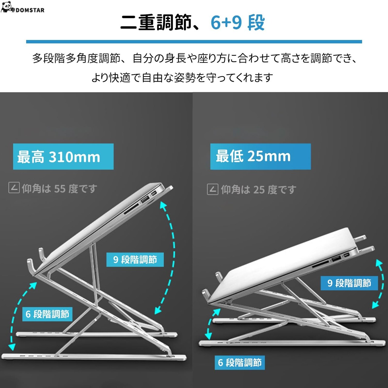 【高さ・角度自在に調整】パソコンスタンドは、自分の身長や姿勢に合わせて高さ(最大310mmまで)や角度を自由に調整できます。正しい姿勢でパソコン作業ができるので、首や肩の疲れ、背中の負担を軽減し、猫背などの姿勢矯正にも効果的です。