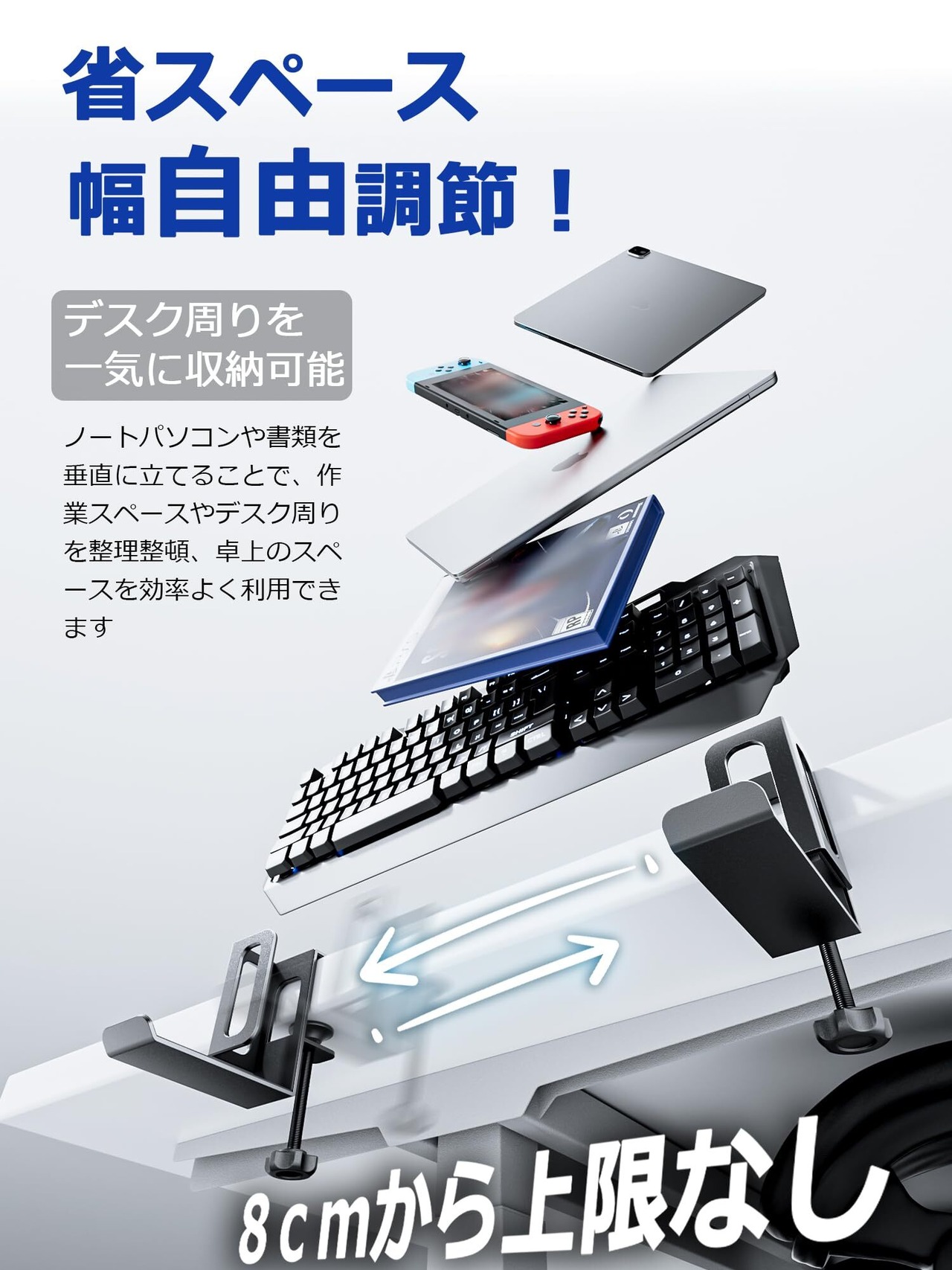 資料やファイルなどの収納に使ってデスクに穴をあけずに装着できるので、幅も任意で変えれます。装着が簡単(クランプで締め込み式)なので外すのも簡単です。デスクにあたる部分は保護パッドがあるため締めこんでも傷は付かない様になっています、ズレたりもなく安定感があります。