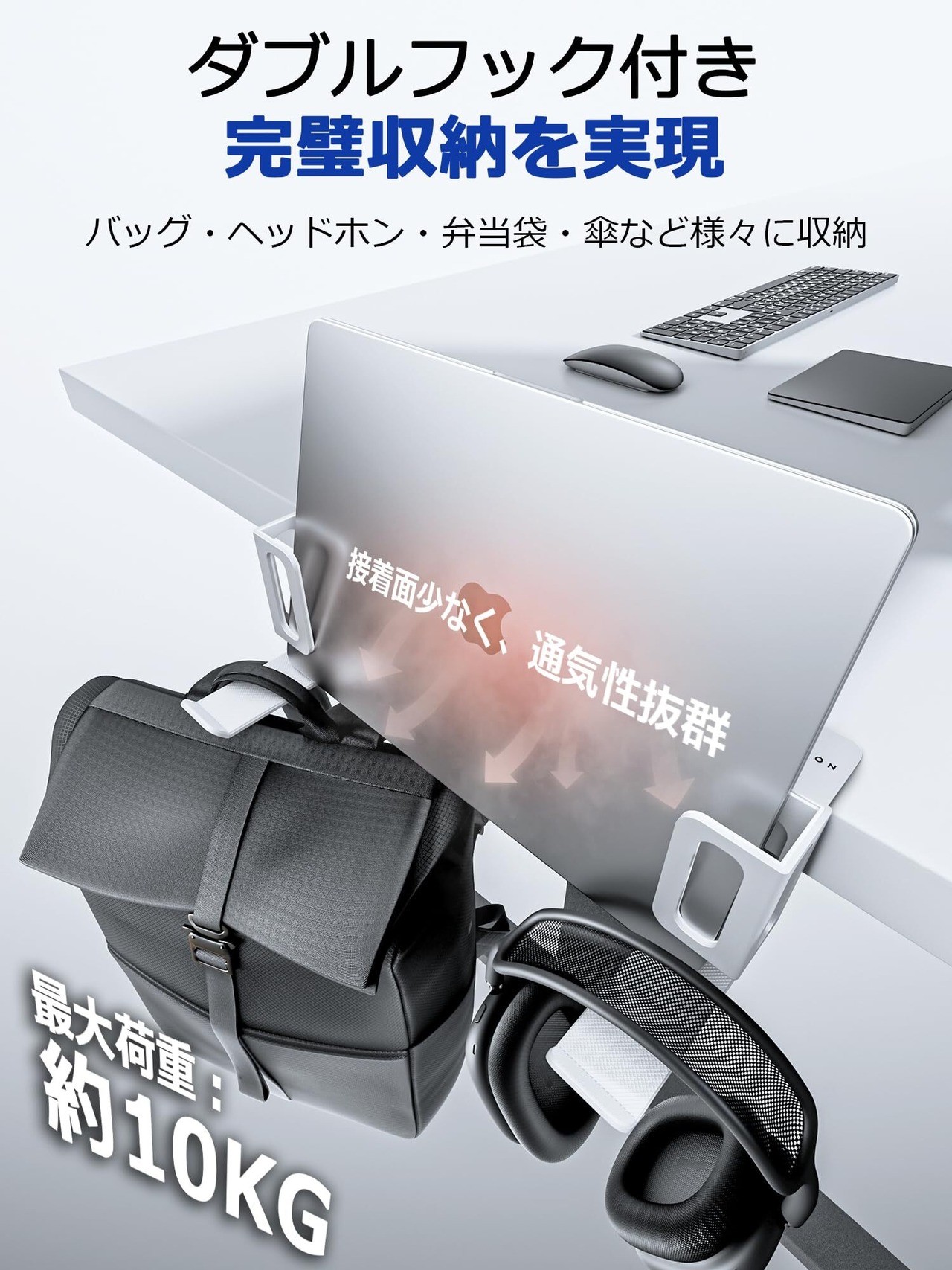 スチール製耐荷重10KG、スチールは厚めで剛性も、しっかりとしていて強度があります。また、下部へカバン等を引っ掛ける所がある、磁石式の小物入れや、下側のフックがとても便利でヘッドホンスタンド・ヘッドホンフォルダーとして役に立ちます。