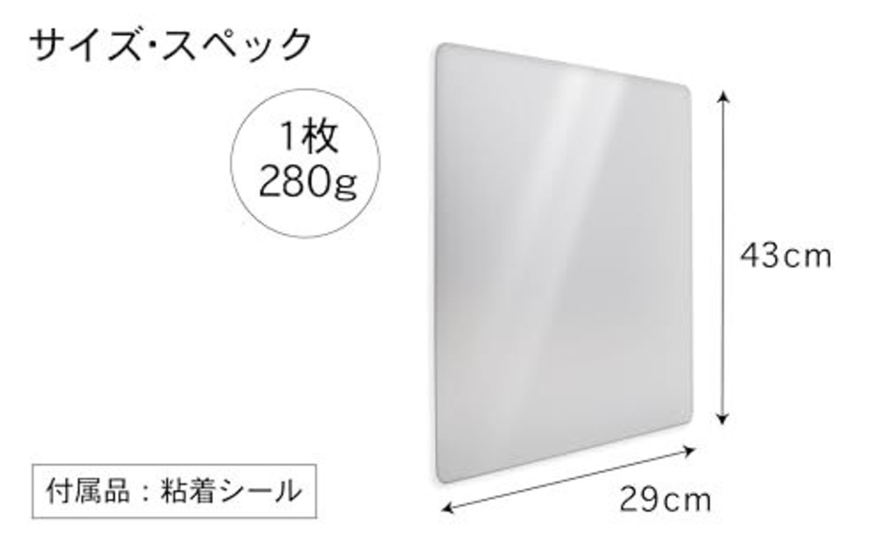 【基本仕様】 アクリル製で軽量・割れにくく、万が一落下しても飛散しません。 また、角を丸くカットしているため、キッズスペースや赤ちゃんのいる場所でも安心してご使用いただけます。 玄関の確認用ミラー、姿見、クローゼットミラーなど、さまざまな場所で活躍します。 AHEARTのミラーは、専門家によるW監修のもと開発された「どこでも貼れる・割れにくい理想のミラー」です。 ※浴室でのご使用は不可となっております。