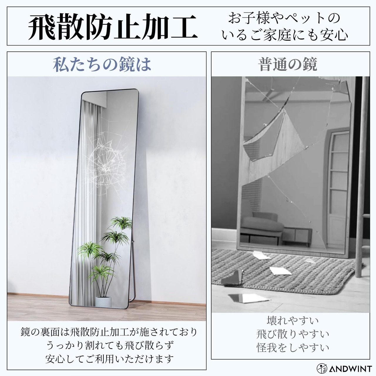 【製品仕様&飛散防止】サイズ:幅36.5×高さ144cm フレーム:アルミニウム合金素材 飛散防止:先進のセキュリティ技術を採用しており、表面には特殊なフィルムが覆われています。これにより、ミラーの堅牢性と耐破壊性が大幅に向上しました。万が一の衝撃があっても、ミラーの破片はフィルムにしっかりと付着し、飛散を効果的に防ぎ、使用者の安全が保証されます。家族により安全で信頼性の高い生活空間を提供します。
