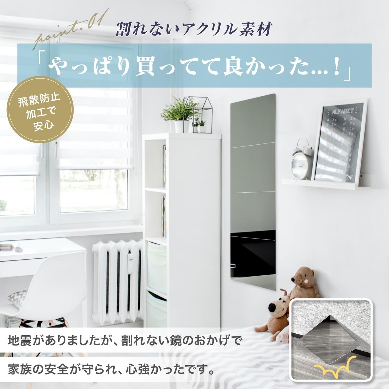 【アクリル製のミラーで怪我ゼロへ】飛散防止、軽量設計の為、万が一落下しても鏡に比べ怪我のリスクが低下します。地震など災害時にも割れる心配が無く、小さなお子様やペットの安全対策としてもオススメです。