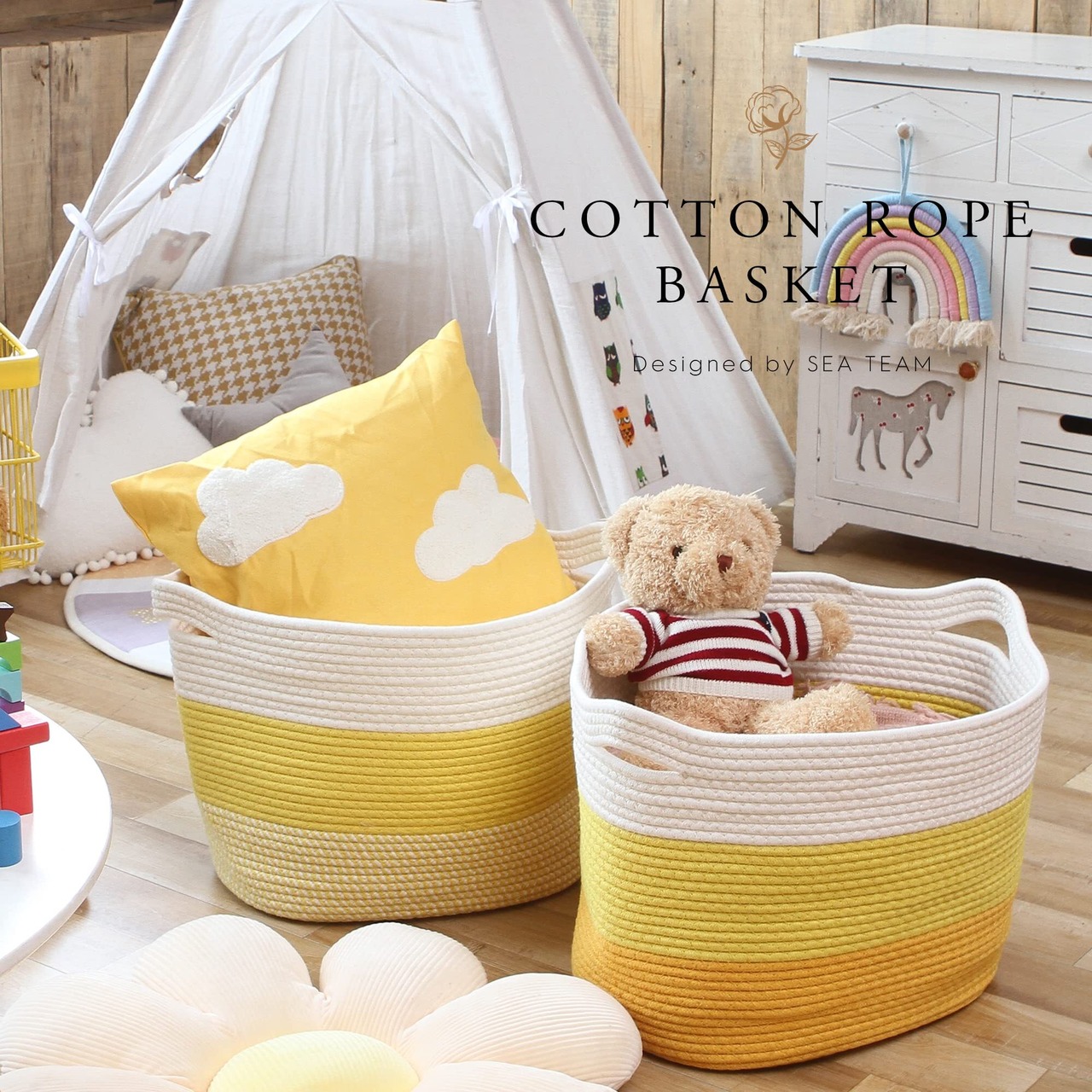 【人気商品】Sea Team 大きいサイズ 収納バスケット 収納かご 洗濯かご ランドリーバスケット ロープバスケット コットンロープバスケット 持ち手付き ランドリー ナチュラル 赤ちゃん 子供用品収納 イエロー グレー ピンク おもちゃ入れ 収納かごインテリア 折り畳み式 40L大容量 (イエロー S 41X31X33cm)