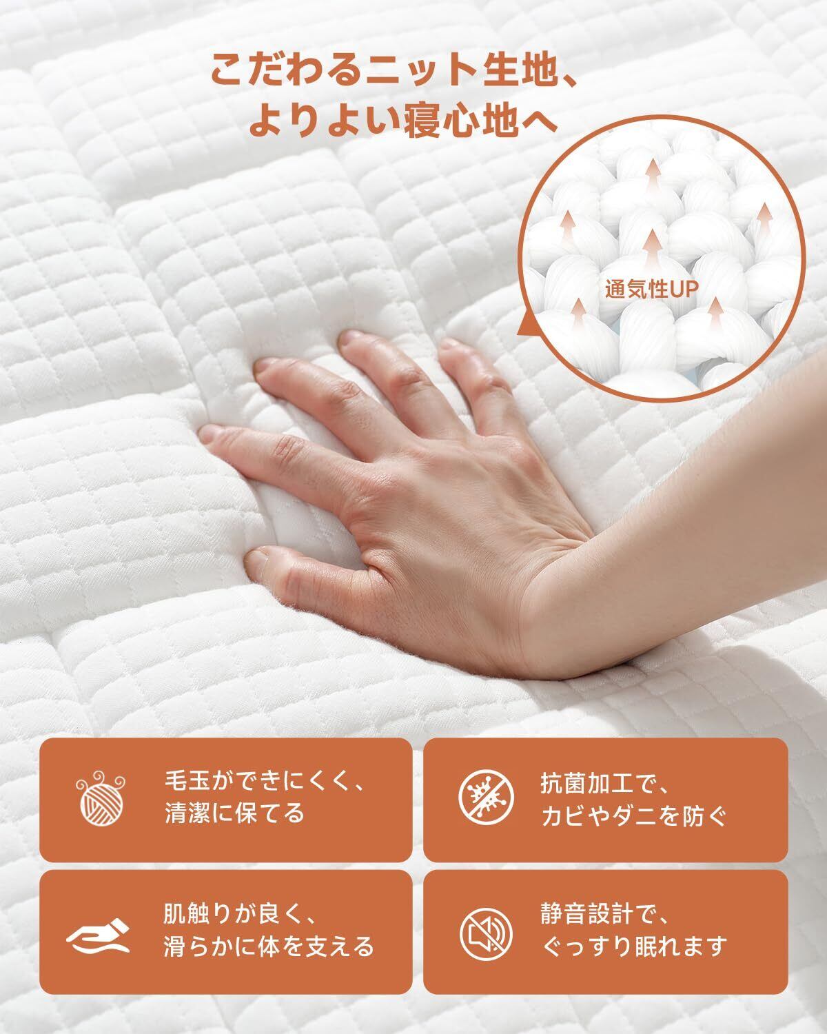 【高密度ウレタンフォーム】:マットレスは、耐久性に優れた高密度の高反発ウレタンフォームを中間層に採用しており、長時間にわたって形状を維持し、変形や沈み込みを防ぎ、持続的な快適さを提供します。また、当社独自の抗菌防臭加工を施した低ホルムアルデヒドのマットレス生地は、通気性が高く、快適な睡眠をサポートします。