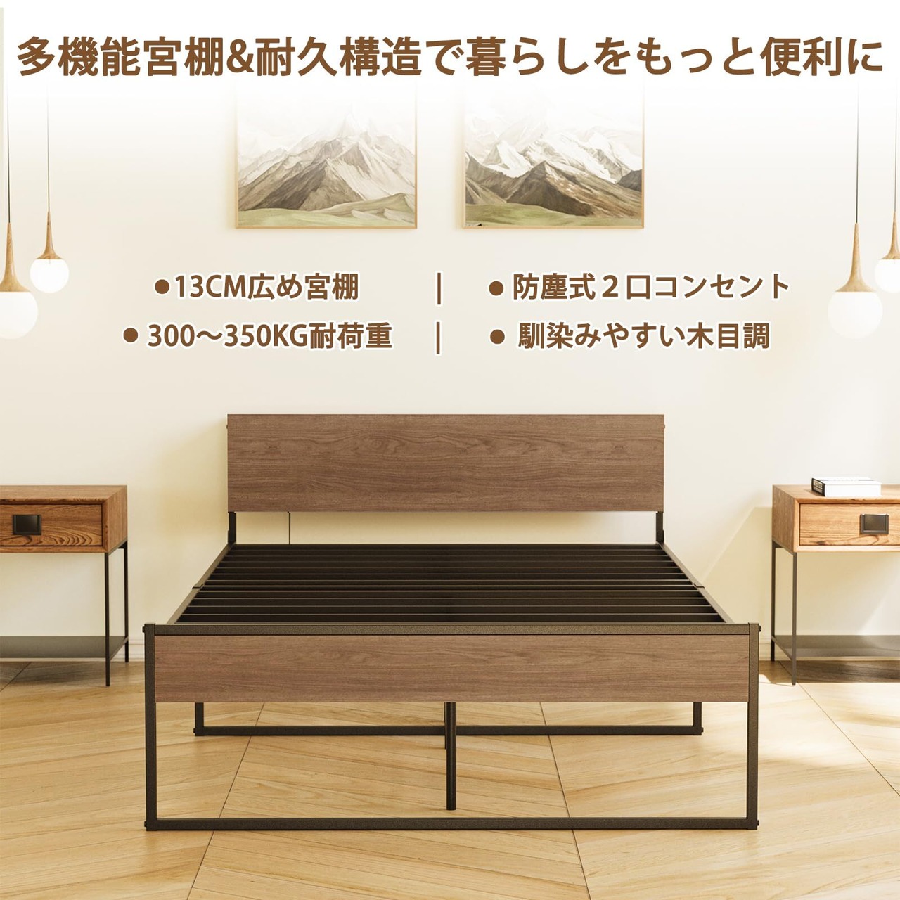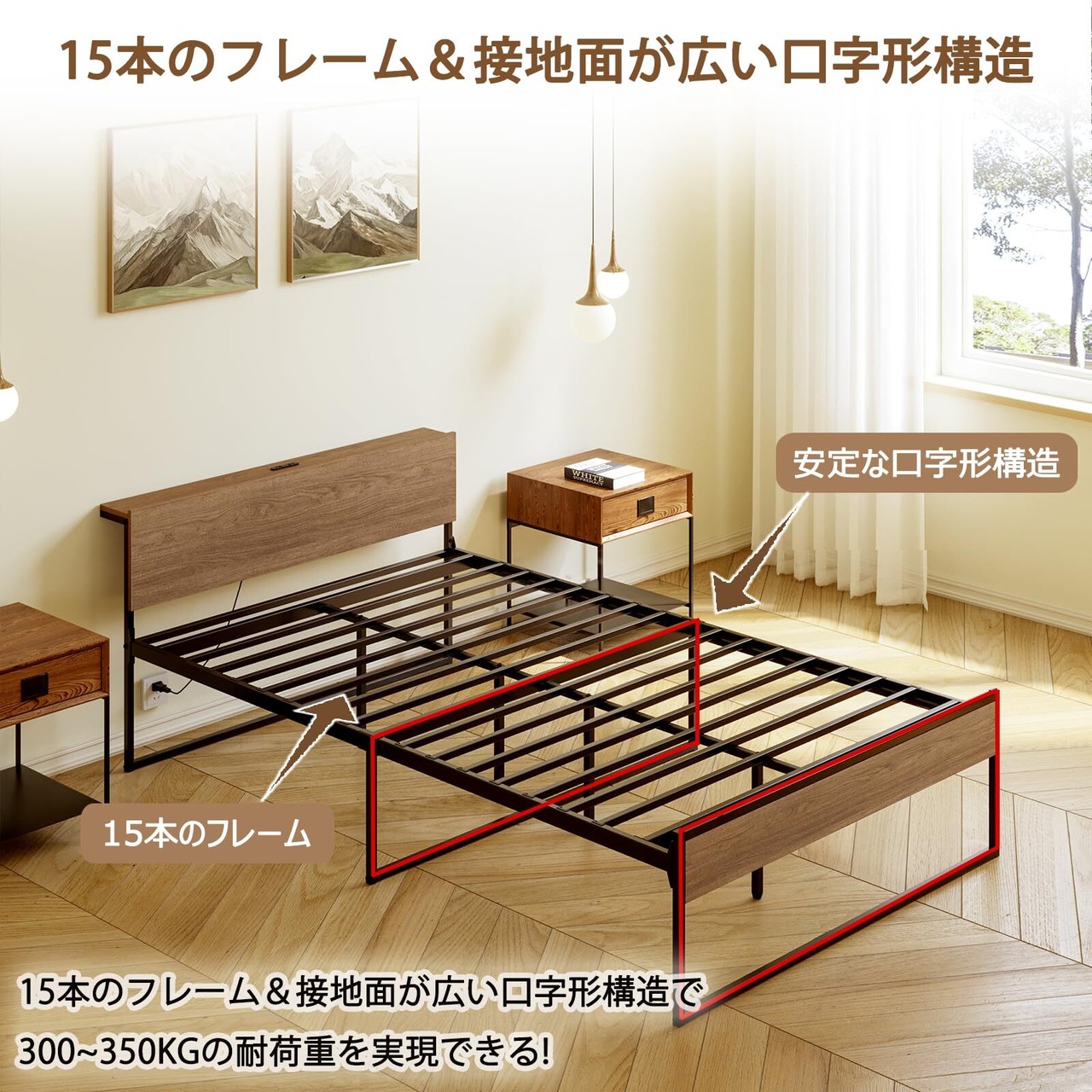 SINNONAKA 2口コンセント ベッドフレーム 宮棚付き セミダブルベッド 静音パイプベッド 高耐荷重 床下高さ30cm収納付き 組立簡単 スチールベッド カビ防止 アイアンベッド 脚付き フレームのみ 頑丈(ウォールナット×ブラック)
