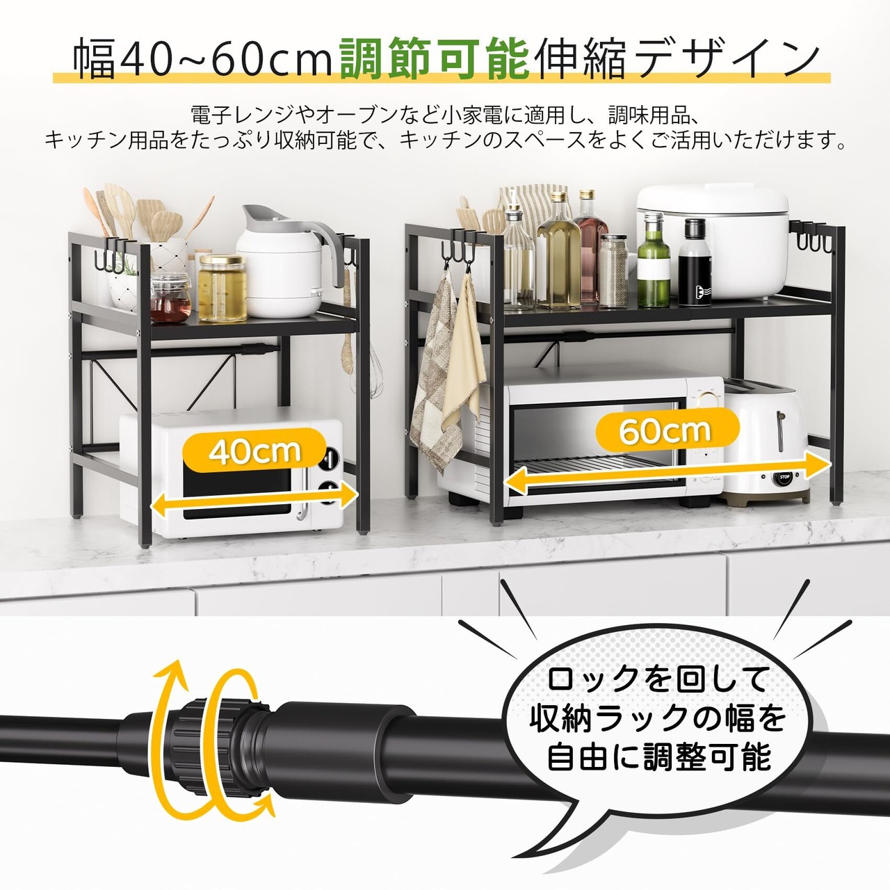 レンジラック レンジ台 幅40~60cm 伸縮式 フック6枚付属で掛ける収納可能 高さ2段階調節 キッチン収納ラック レンジボード トースターラック 調味料棚 省スペース 耐荷重30kg