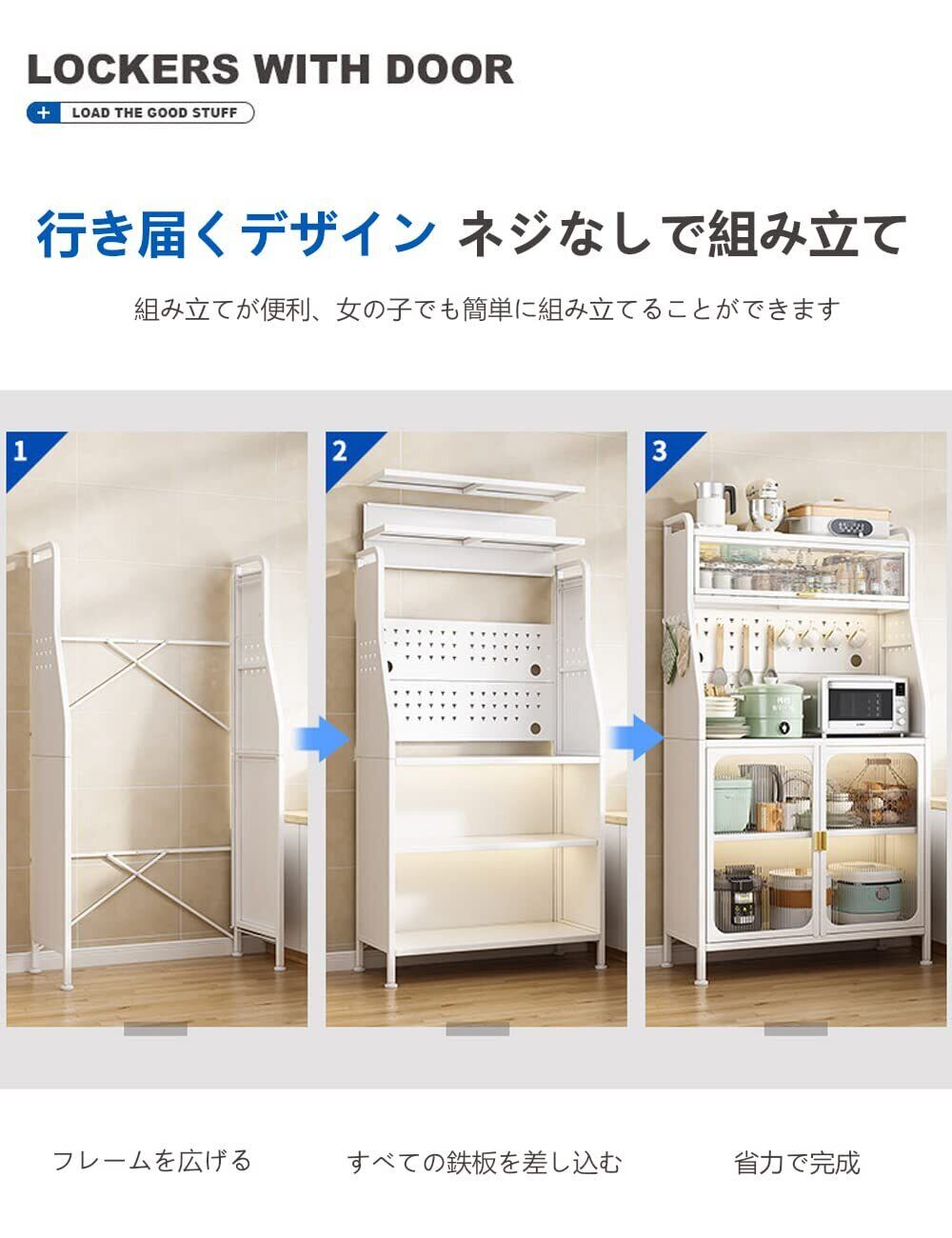 【行き届くデザイン】①食器棚の脚は2種類もあり、360°回転できるキャスターと高さ微調整脚を場合によってお使いいただけます。調整脚は組み立てができて揺れを感じたら、4つの脚とも回して高さを微調整して、4つの脚を全部地面にピッタリ立てば、たとえ平たいでない地面でも揺れなく使用できます。②食器棚の股下は地面までの距離は12cmほどあるので、下の空間が掃除しやすく、ロボット掃除機でも下の空間に入れて便利に掃除できます。③食器棚は全体はスナップ式で構成していて、ネジ一本も使わずので、組み立てがより早く、より手間や労力を省くことができ、説明書に従って、女の子でも簡単に組み立てられます。