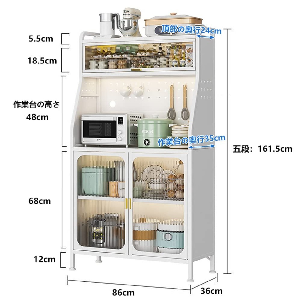食器棚 家電収納 家電ラック 5段 キッチンラック キャスター&調整脚付き フック付き 電子レンジ 炊飯器 透明ドア 防塵 スライドドア キッチン作業台 ホワイト 幅86×奥行36×高さ161.5cm
