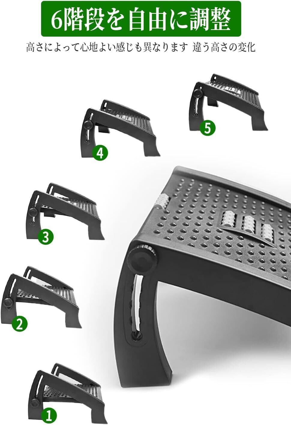 「6階段調整」1-6階段を自由に調整できます。(9cm、11cm、13cm、15cm、17cm、19cmに分けられる)お好みに応じてビッタリした高度を調整し、仕事中に足の疲れを解させてくれます。高齢者から子供まで適用しているものです。