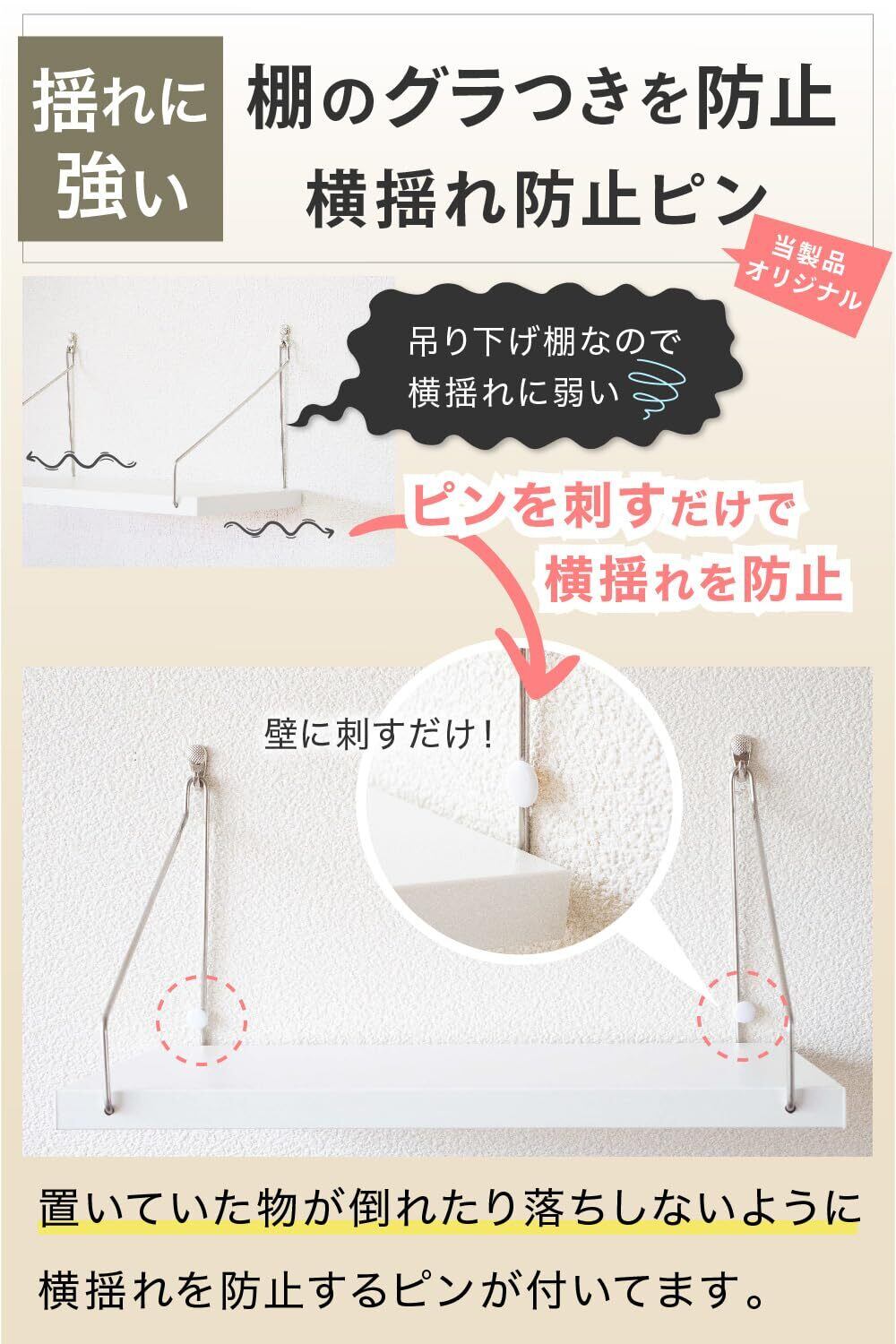 【シルバーアイアンフックは当店だけ!】 シルバーアイアンフックは当店のオリジナルセットです。 オシャレで取り付けも簡単な当店シェルフを是非お選びください。取り付けも道具不要で1枚2分で取付可能です! 取り付け後も小さな針穴( 画鋲 くらい)が空くだけなので、賃貸住宅でも壁を傷つけないで取り付けができます。引っ越しの時の原状回復もらくらくです。 ※付属のフックは石膏ボード壁、薄い木質壁用です。すべての壁に取り付けできるわけではございません。ご注意ください。 【オリジナル 横揺れ防止ピン付き】 フックに引っ掛けるタイプの棚なのでそのままでは横に揺れてしまいます。 その横揺れを防止するために「横揺れ防止ピン」を同封しています。壁に刺すだけで横揺れを防止し、置いた物が落下しにくくなります。(必ず取り付ける必要はありません)