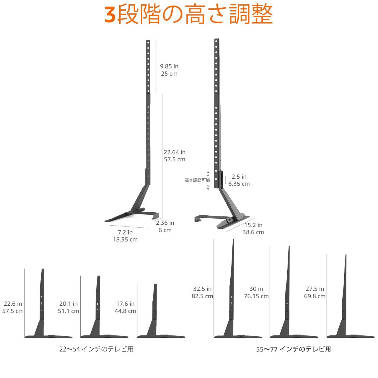 このスタンドは、70cmから83cmまでの3段階の高さ設定で優れた調整が可能で、最適な視野角を確保します。広々としたブラケット脚は、安定性を維持しながら家具を配置するための十分なスペースを提供します。