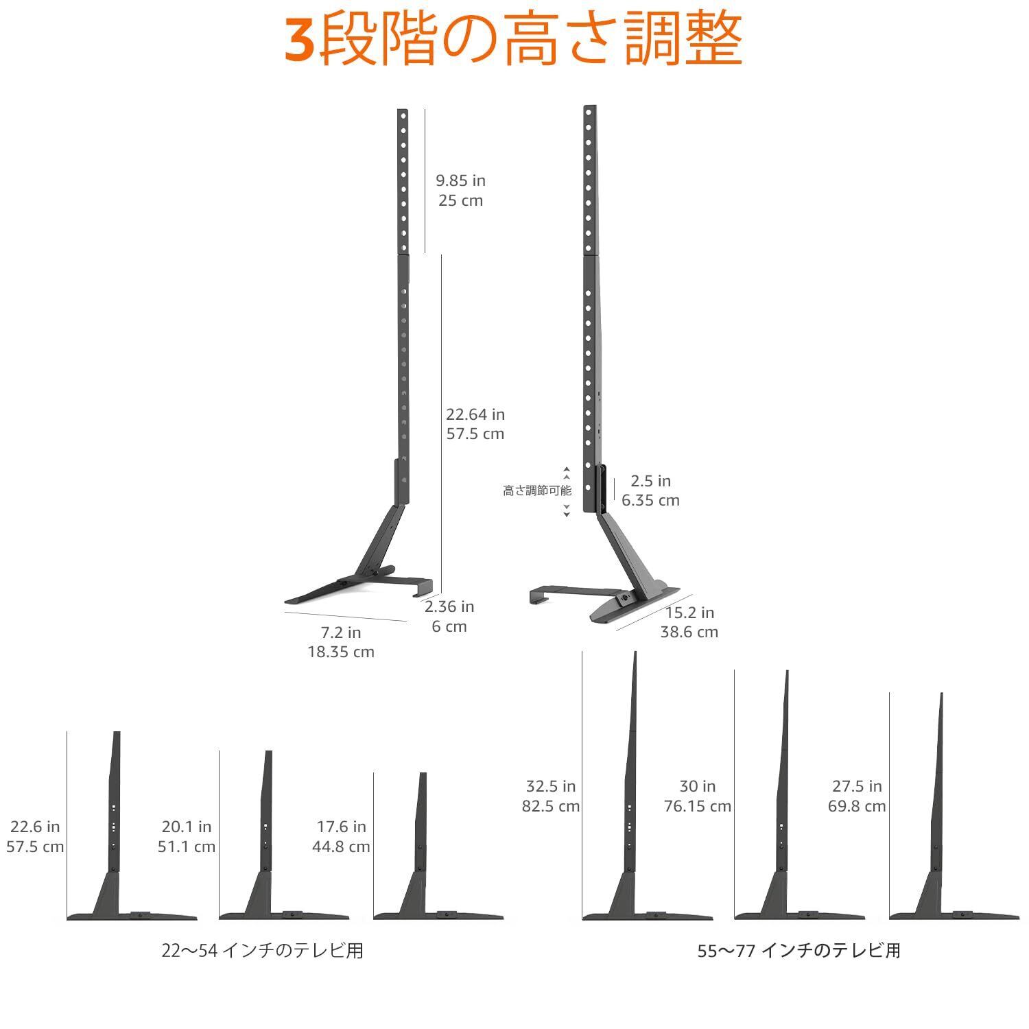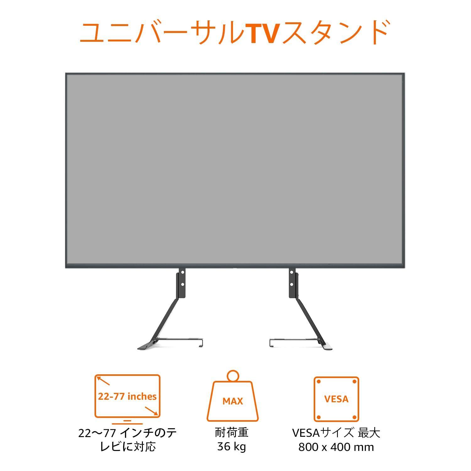 万能なテーブルトップテレビスタンドは、56 cm(22インチ)から196 cm(77インチ)の範囲のテレビに対応するように設計されており、最大36kg(80ポンド)の重量をサポートします。互換性を念頭に置いて設計されており、テレビの背面にある200mm x 100mm(8インチx4インチ)から800mm x 400 mm(31.5インチx15.7インチ)までのVESA取り付け穴にシームレスにフィットします。テレビをテーブルに簡単に固定でき、安全性と安定性を実現。