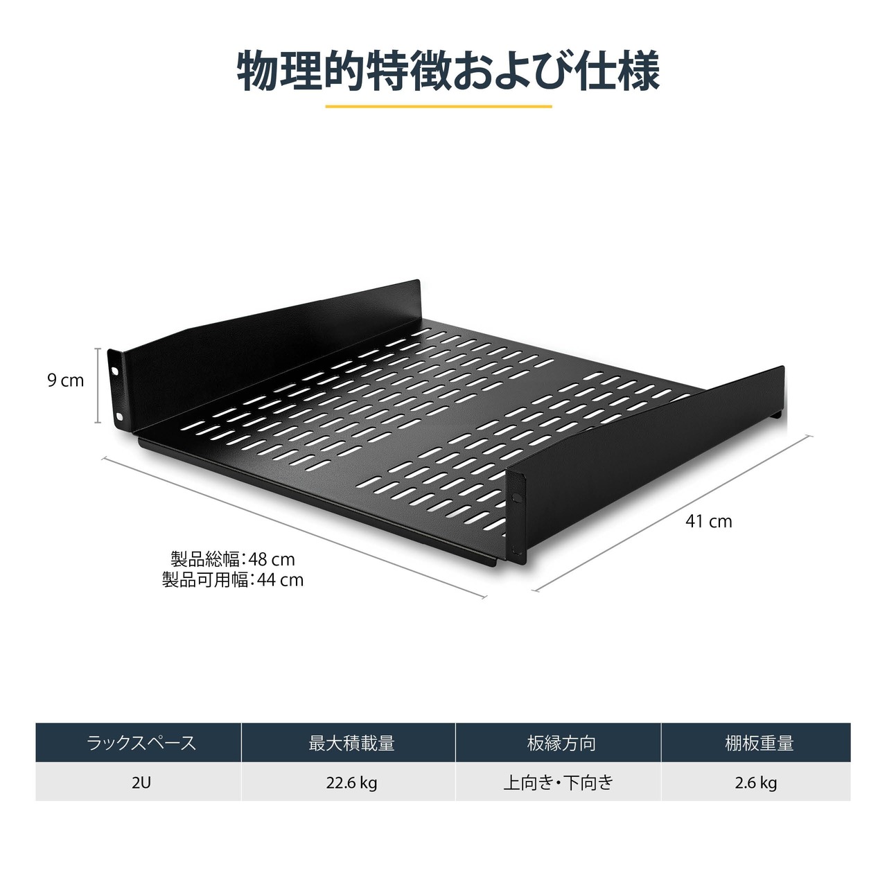 ユニバーサルフィット:19インチ型サーバーラック各種に対応する放熱スリット付き2U棚板。内部奥行41cm、各種データ機器、IT/ネットワーク装置、ラックマウント非対応の装置を収納