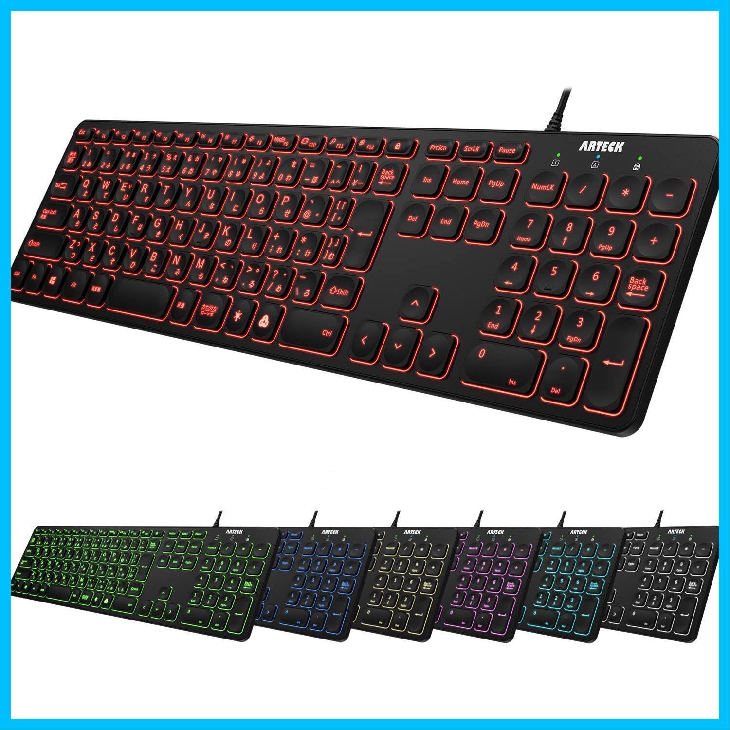 Arteck USB 有線 ワイヤー キーボード 7色バックライト搭載 明るさ変更 フルサイズ 6フィート(約1.8メートル)コード テンキー付き コンピューター、デスクトップ、PC、ラップトップ、Windows11/10 /8/7との交換性あり
