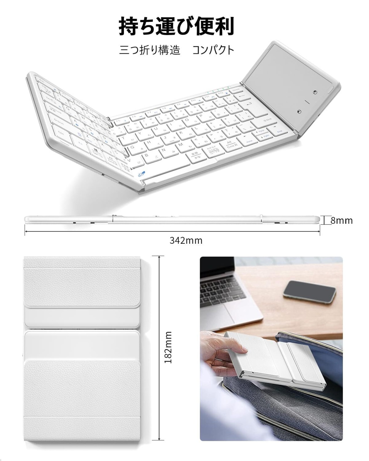 【最新型】Omikamo キーボード bluetooth 折り畳み式 ワイヤレス JIS標準日本語配列 ipad キーボード スマホ マルチペアリング タッチパッド付き iOS/Windows/Android/Mac/Google対応 無線 コンパクト 軽量 薄型 ipad mini パンタグラフ 充電式(白)