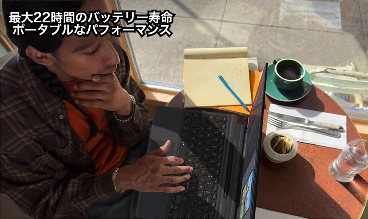 2. **超薄軽量 & 高い携帯性** 厚さ約5mm・軽量設計でバッグにすっきり収納。外出先やカフェでの作業に最適なポータブルキーボード。