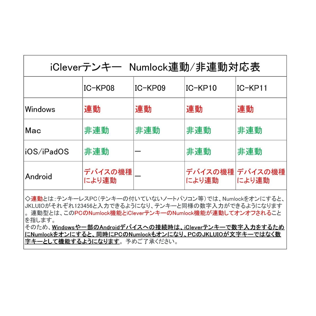 【Numlock連動】接続先デバイスがWindows/Androidの場合は、テンキーは接続先デバイスのNumlockに連動する【連動型】となります。 Mac/iOSデバイスと接続する場合のみ、テンキーは【非連動型】となります。Windows/AndroidのテンキーレスPCでは、文字キーの一部がNumlockと連動するため(JKLUIOがそれぞれ123456になります)、予めご注意ください。