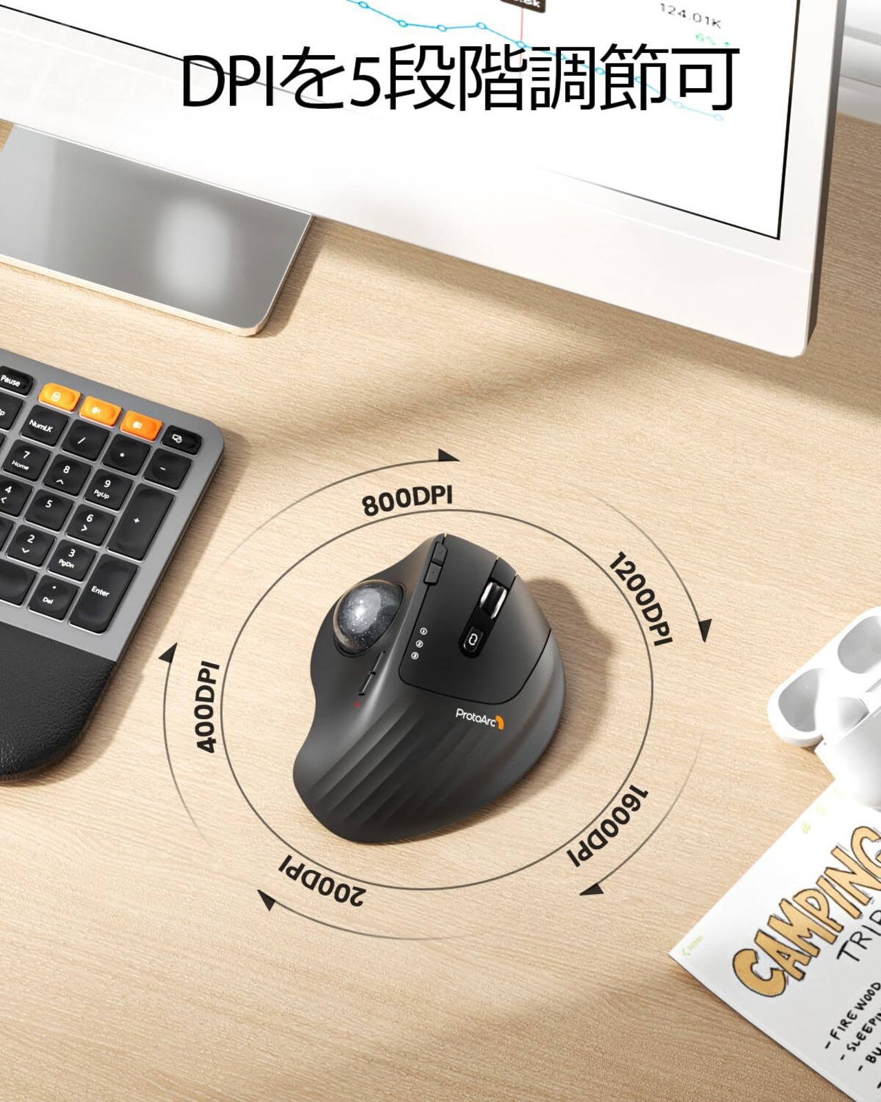 【在庫処分】ProtoArc トラックボールマウス 2.4GとBluetooth対応 3台デバイス同時接続 5段階DPI 7ボタン 無線 windows/mac/iPad対応 USB-C充電式 長時間PC作業 静音 自宅/オフィス用 USBレシーバー付属 多色ボール選べる 日本語取扱説明書 (JP, くろつるばみ)
