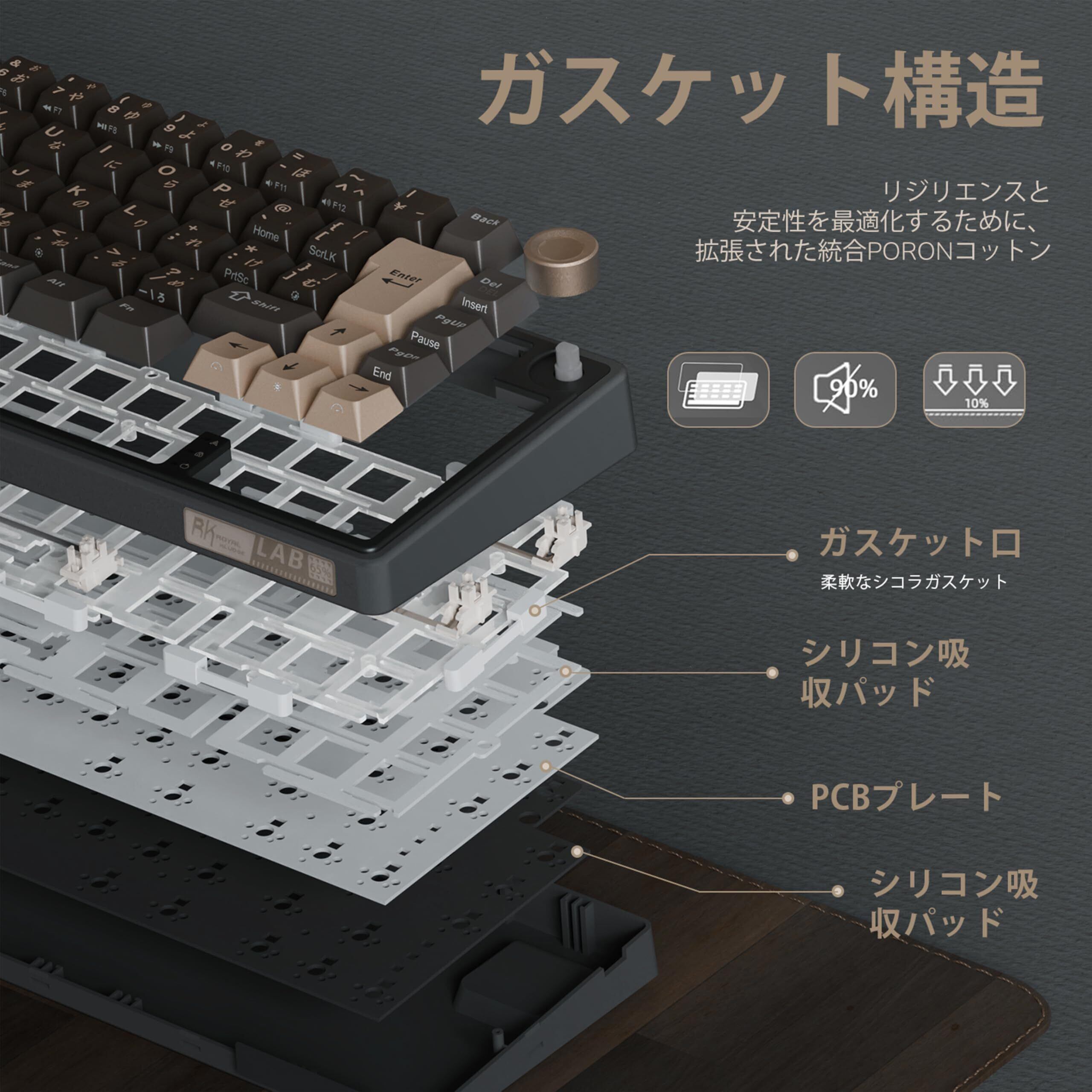 【60%サイズ・ガスケットマウントメカニカルキーボード】 コンパクトながら高性能な60%メカニカルキーボード。内部には5層の吸音材を使用したガスケットマウント構造を採用。PCBボードとケースの間に高弾性ポロンコットンを挟み込むことで、キーの打鍵音と振動を効果的に低減。スイッチのサウンドを最適化し、より滑らかで心地よいタイピング体験を実現します。