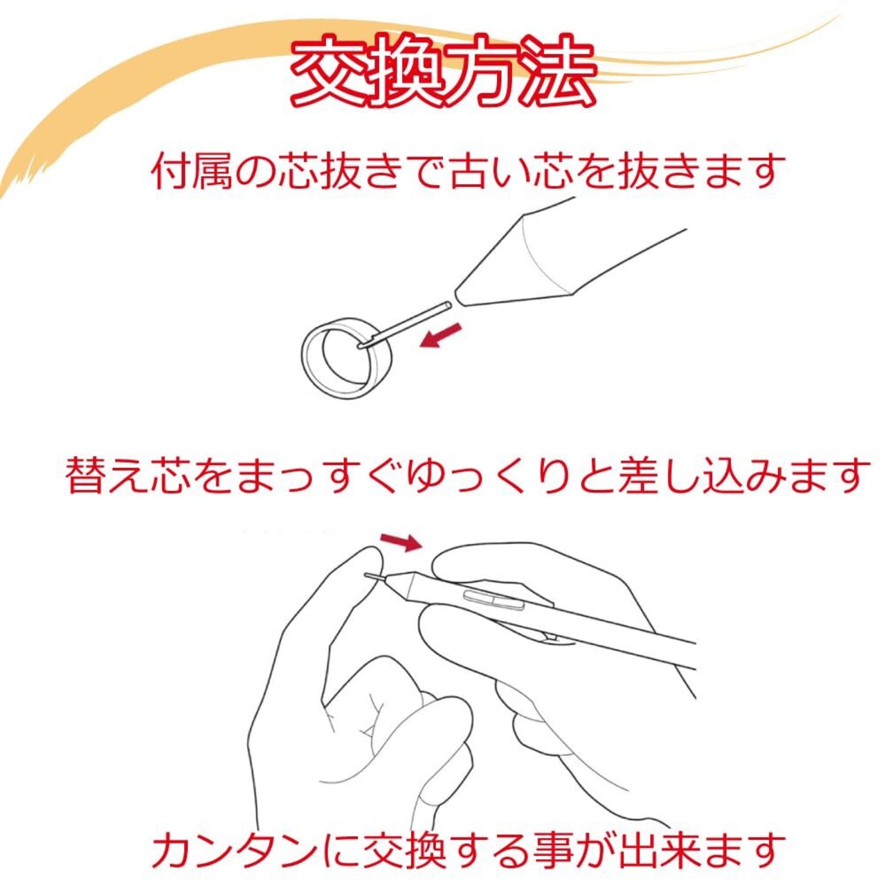 【交換方法】 付属のリング型芯抜で古い芯を挟み抜く。替芯をまっすぐゆっくりと差し込むと簡単に交換できる。