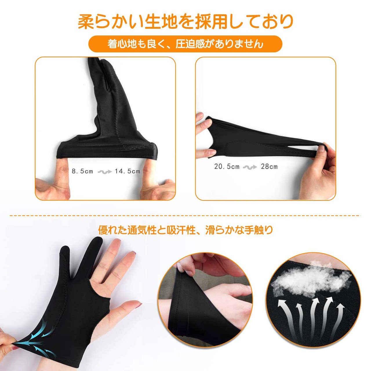 【快適な素材】優れた通気性と吸汗性のある素材で作られたアーティストグローブです。柔らかい生地を採用しており、着心地も良く、圧迫感がありません。高級感ある黒色を採用して、ペーパースケッチとモニター画面の汚れを軽減します。