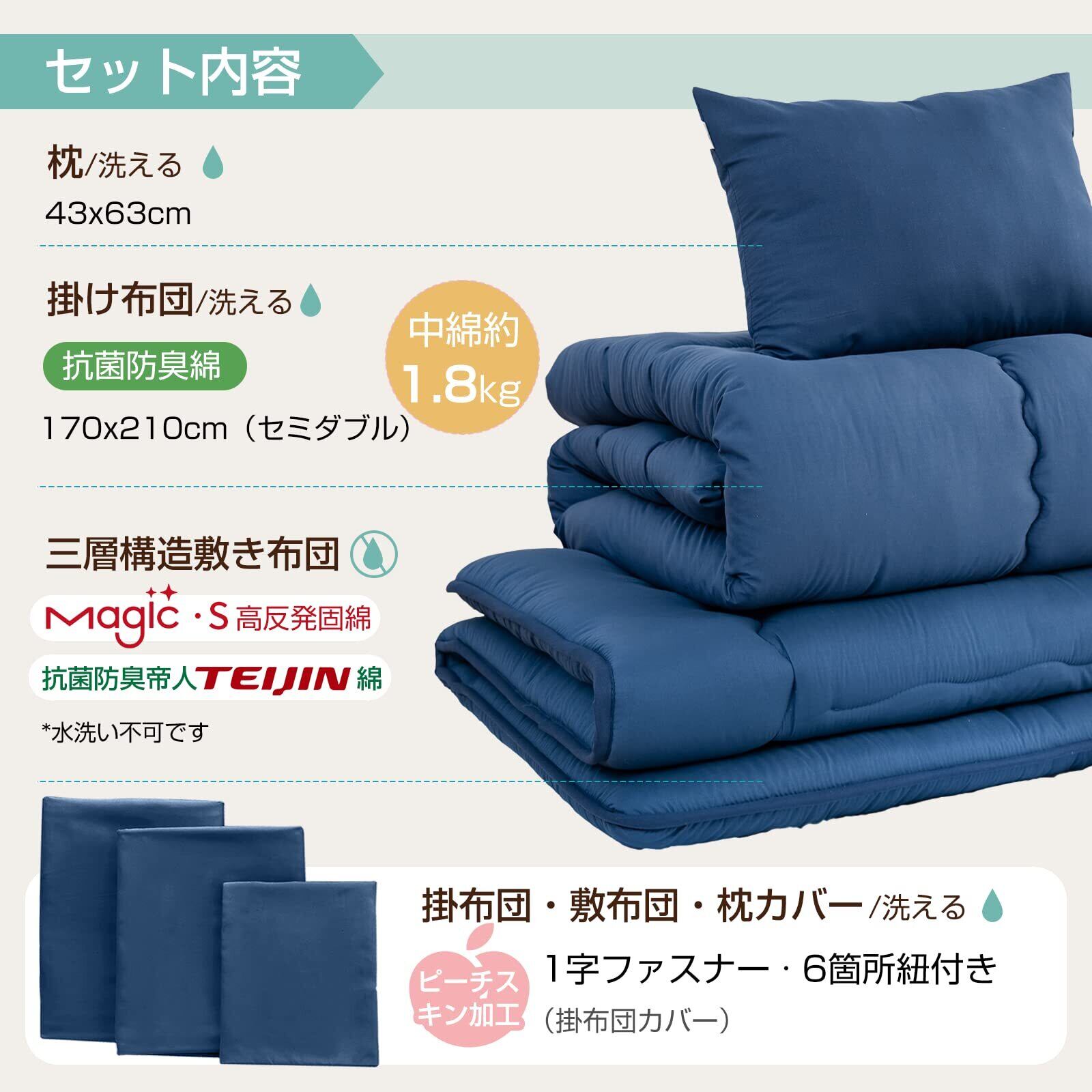 Sun Deco 布団セット セミダブル 布団 7点セット 寝具セット 来客用布団【SEK認証】【TEIJIN マイティトップ中綿使用·敷き布団】防菌防臭 洗える ふとんセット 布団せっと 中綿約1.8kg 掛け布団 セミダブル 敷布団 枕 布団カバー3点 収納ケース付き ピーチスキン加工 オールシーズン 防カビ 無地 こんいろ