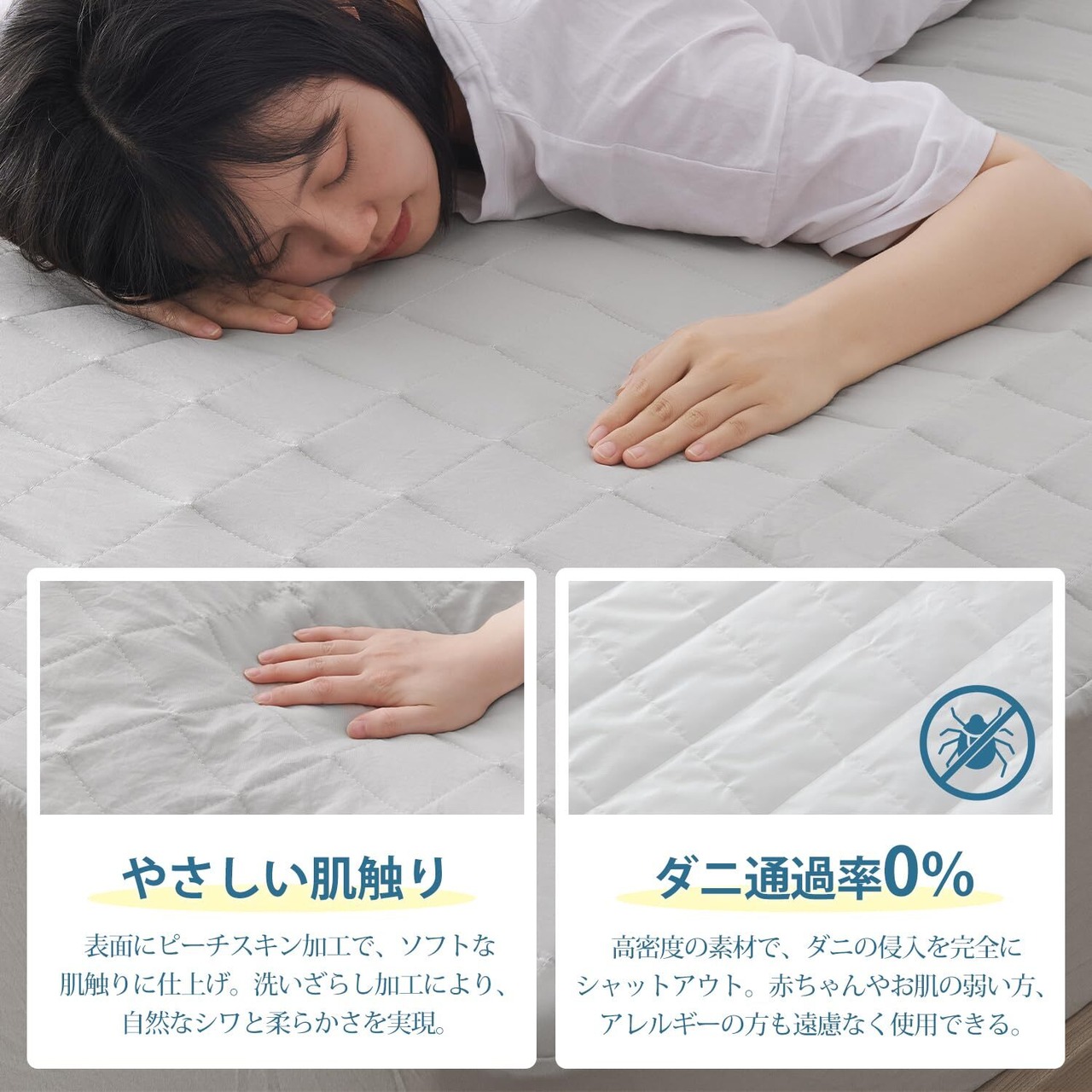 【優しい肌触り】表面はソフトで気持ちいいピーチ生地で、洗いざらし加工により、自然なシワと柔らかさを加え、天然素材の風合いを引き出し、サラサラした触り心地で一年中快適。防水機能・抗菌防臭機能・ダニ対策と機能もしっかりから、赤ちゃんや肌の弱い方、敏感肌の方も安心してお使いいただけます。