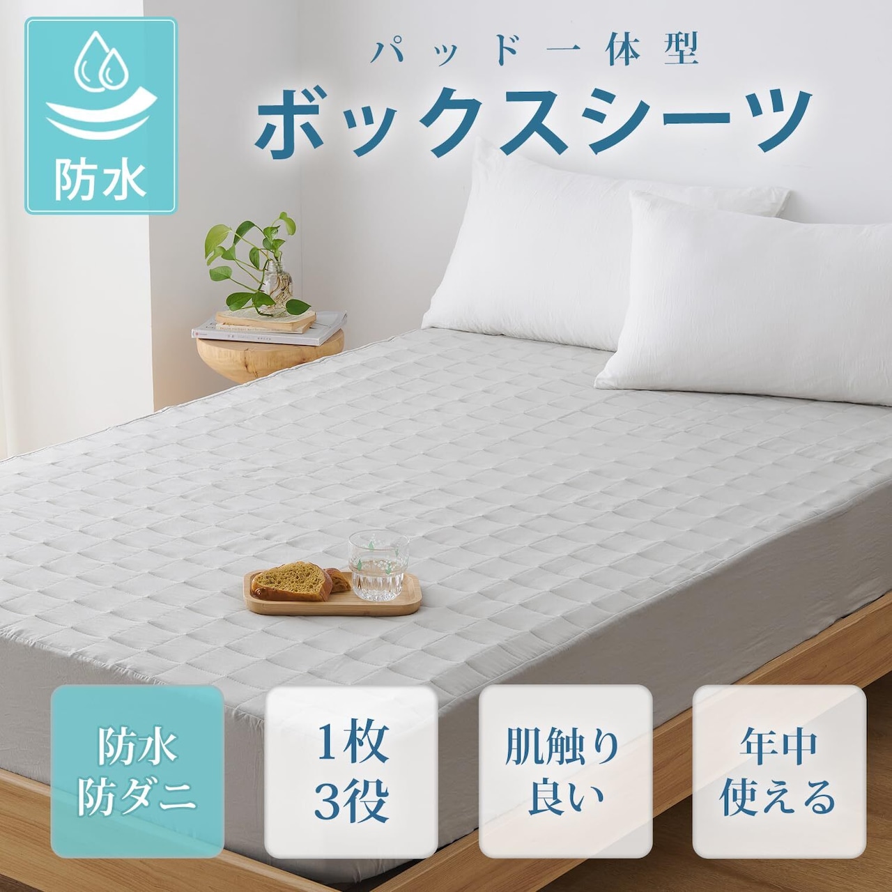 【1枚3役】防水シーツ、敷きパッドとボックスシーツが合体で楽々!ほどよいボリュームの中綿を充填して、ふんわり心地よい寝心地を実現。普通のボックスシーツより厚くて、柔らかさと反発性を兼ね備えたパッド一体型ボックスシーツです。