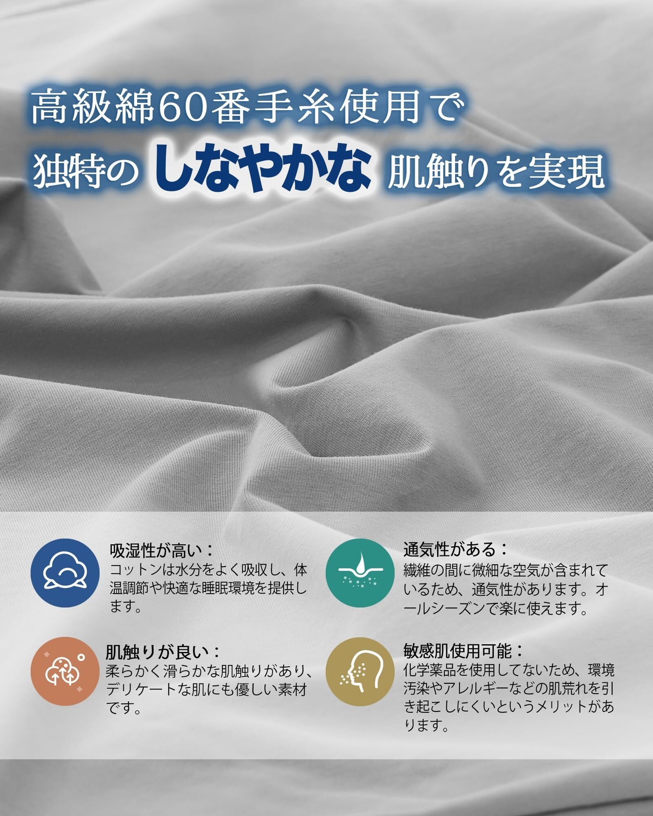 【天然綿·上質なやさしさと肌ざわり】枕カバーは顔に直接に触れるものなので、安心できる天然綿が肌に一番よいです。天然コットンの高い吸湿性と上質な触感を組み合わせで、しなやかな肌触りを提供します。天然の麻に匹敵する通気性は、驚くほど心地よいです。弊社独自のしなやかな触感のコットン生地は柔らかくて、快適な睡眠環境を提供します。