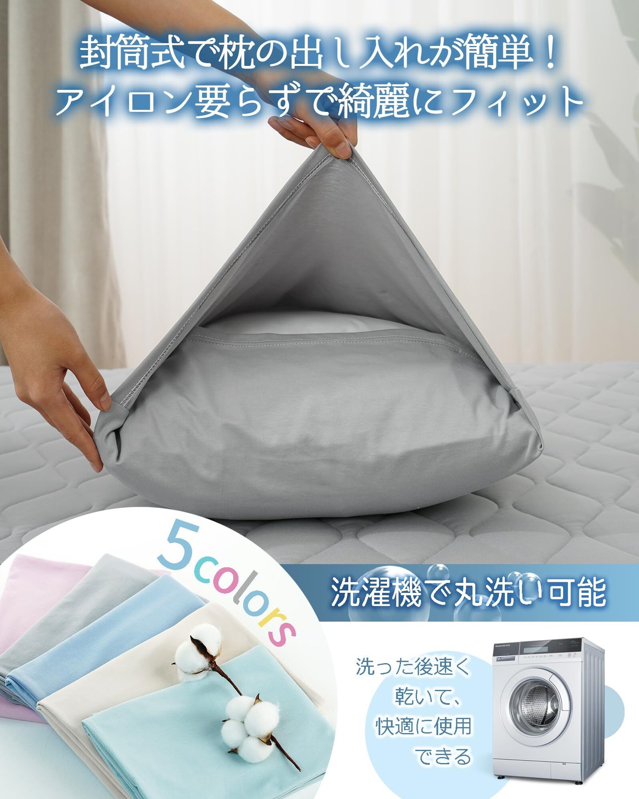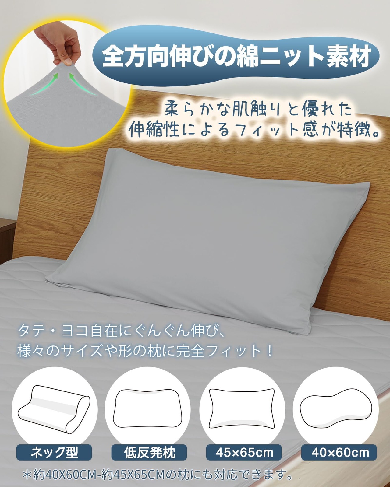 【封筒式・伸縮性抜群各形各サイズの枕適用】伸縮性に優れタテにもヨコにも伸びるストレッチ素材だから、様々な素材や形の枕にもぴったりフィットします。手間をかけず簡単に装着可能。中に枕を入れ、余りを内側に折り込んで使う重ね折りタイプです。まくらの両サイドまでしっかり包みこみ、汚れなどを防ぐことができます。金具を一切使用していないため肌や髪にやさしい。ご自宅で気軽に洗濯できます。洗濯時にピローケースの出し入れもラクラクです。