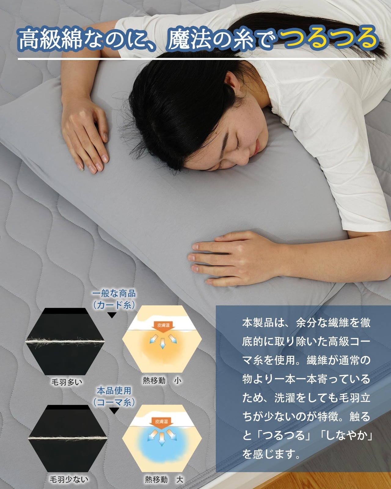 【速乾性・通気性天然】厳選された上質なコーマ糸を使用し、特殊な強撚技術で糸を緻密に編み込んでいます。毛羽立ちを最小限に抑え、心地よい肌触りを実現しました。弊社の枕カバーの熱伝導率(Qmax値)は0.33。通常の綿の2.5倍という高性能で、速乾性と通気性も数倍に上げます。寝汗をしっかり吸収し、快眠へ!朝まで心地よい温度をキープします。