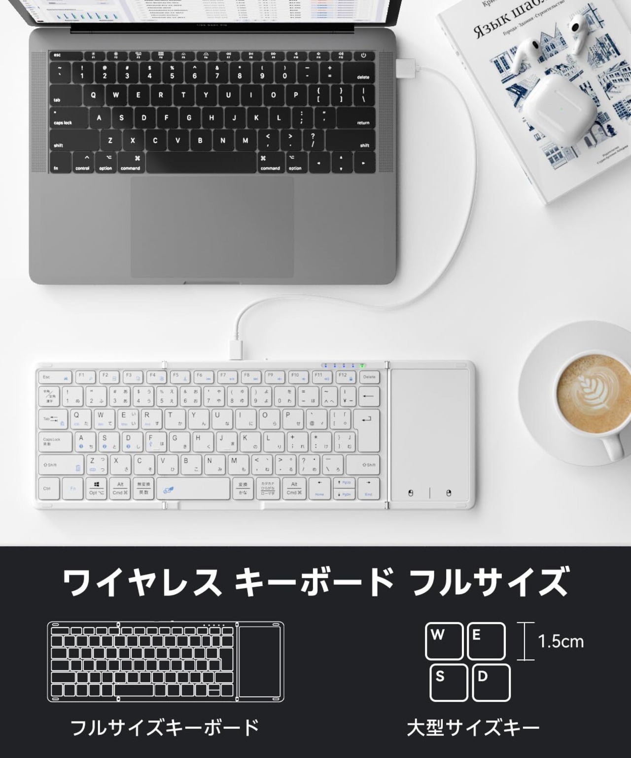 【最新型】Omikamo キーボード Bluetooth 折り畳み式 ipad キーボード ワイヤレス タッチパッド付き 日本語配列 有線&無線両用 左右Shiftキー/L型Enterキー搭載 フルサイズ マルチペアリング Android/Win/Mac/iOS/Google対応 USB充電式 パンダグラフ コンパクト 静音 軽量 薄型 電量確認可(ホワイト)