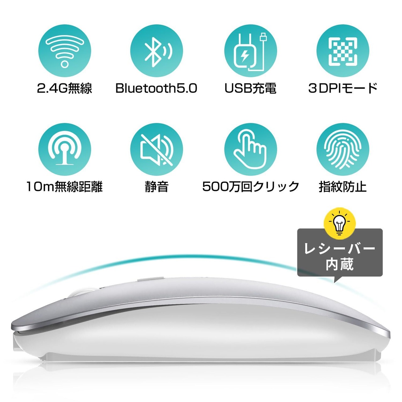 ワイヤレスマウス Bluetoothマウス 無線 超薄型 静音 充電式 省エネルギー 2.4GHz 3DPIモード 高精度 持ち運び便利 iPhone/iPad/Mac/Windows/Surface/Microsoft Proに対応 (シルバー)