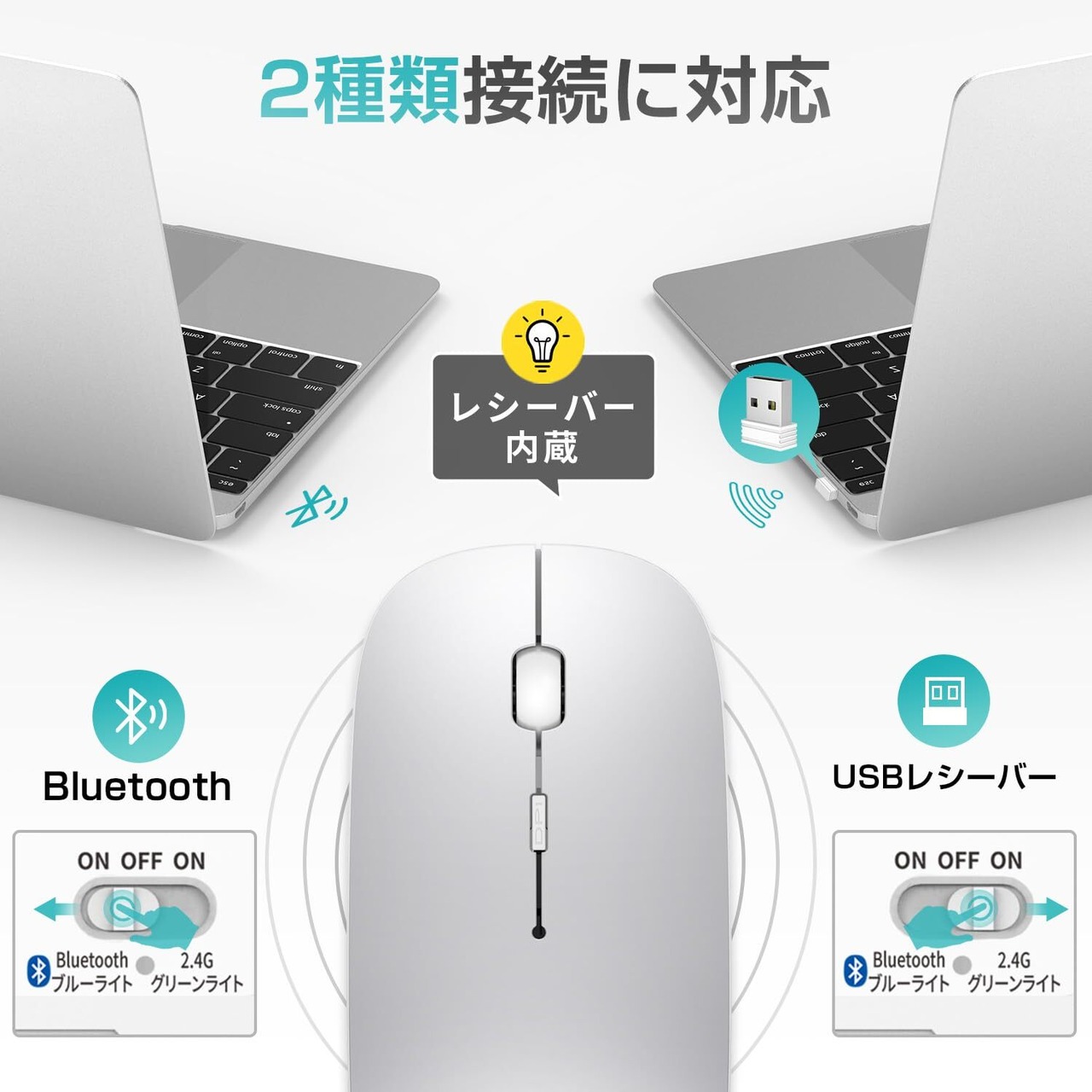 よくある質問: ①ブルーライトについて、接続の時に一瞬光るのタイプです、常に点灯している状態ではありません。 ②レシバーについて、レシバーはマウスの背面に収納されておりますので、ぜひご注意ください。 ③接続について、マウス背面のOFFボタンを接続のモードによって切り替わる必要があります。USBレシバーの場合は、スイッチを右の「2.4G」のところに移ります;Bluetoothの場合は、スイッチを左の「Bluetooth」のところに移って、それに、青いの「Bluetooth接続ボタン」を2~3秒ぐらい長押ししてペアリングできます。 注:商品使用について不明な点がございましたら、ぜひ店舗名をクリックして質問してください、迅速な対応を行います、ご安心ください。