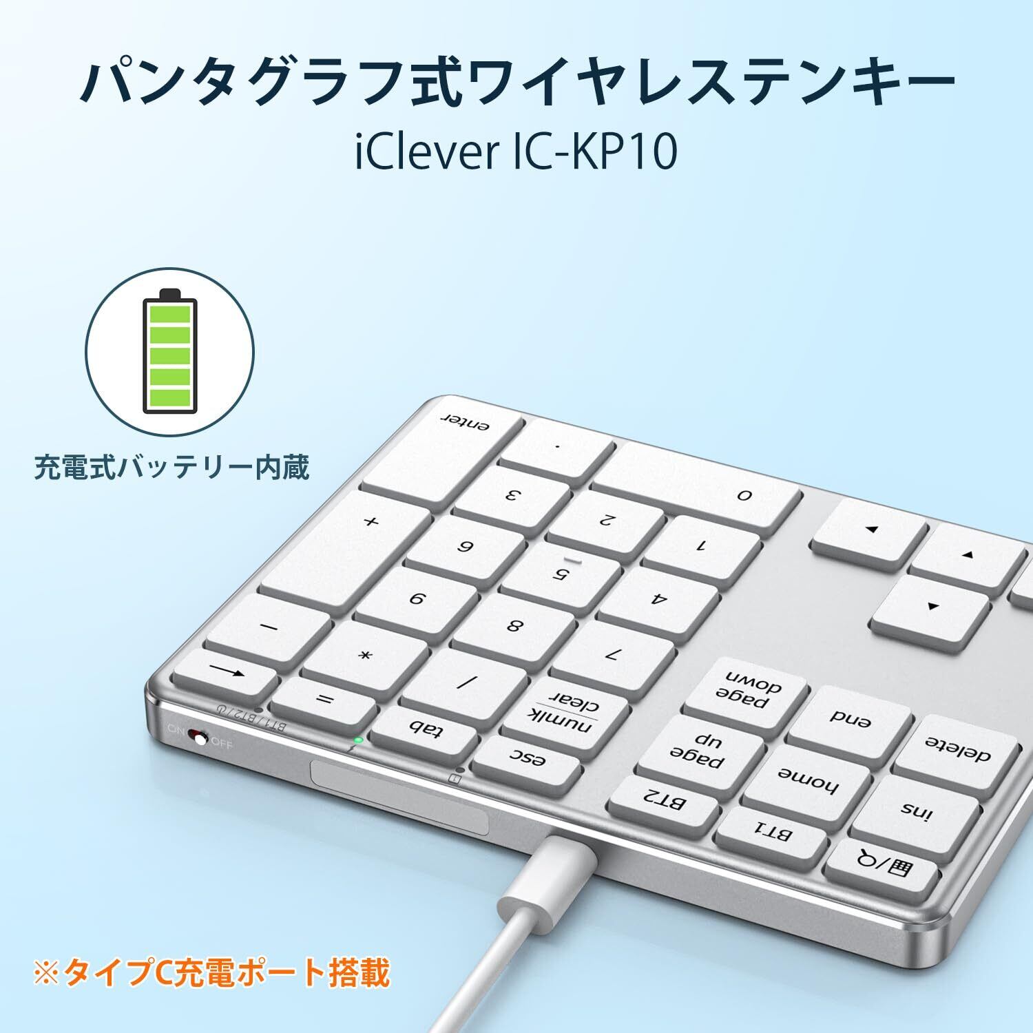 iClever テンキー Bluetooth ワイヤレス 数字 キーボード パンタグラフ式 Type-C充電 超薄型 金属構造 numlock連動 2台まで接続可能 ブルートゥース ナンバーパッド 34キー mac テンキー 片手デバイス Windows/iOS/Android 対応 IC-KP10 (銀白)