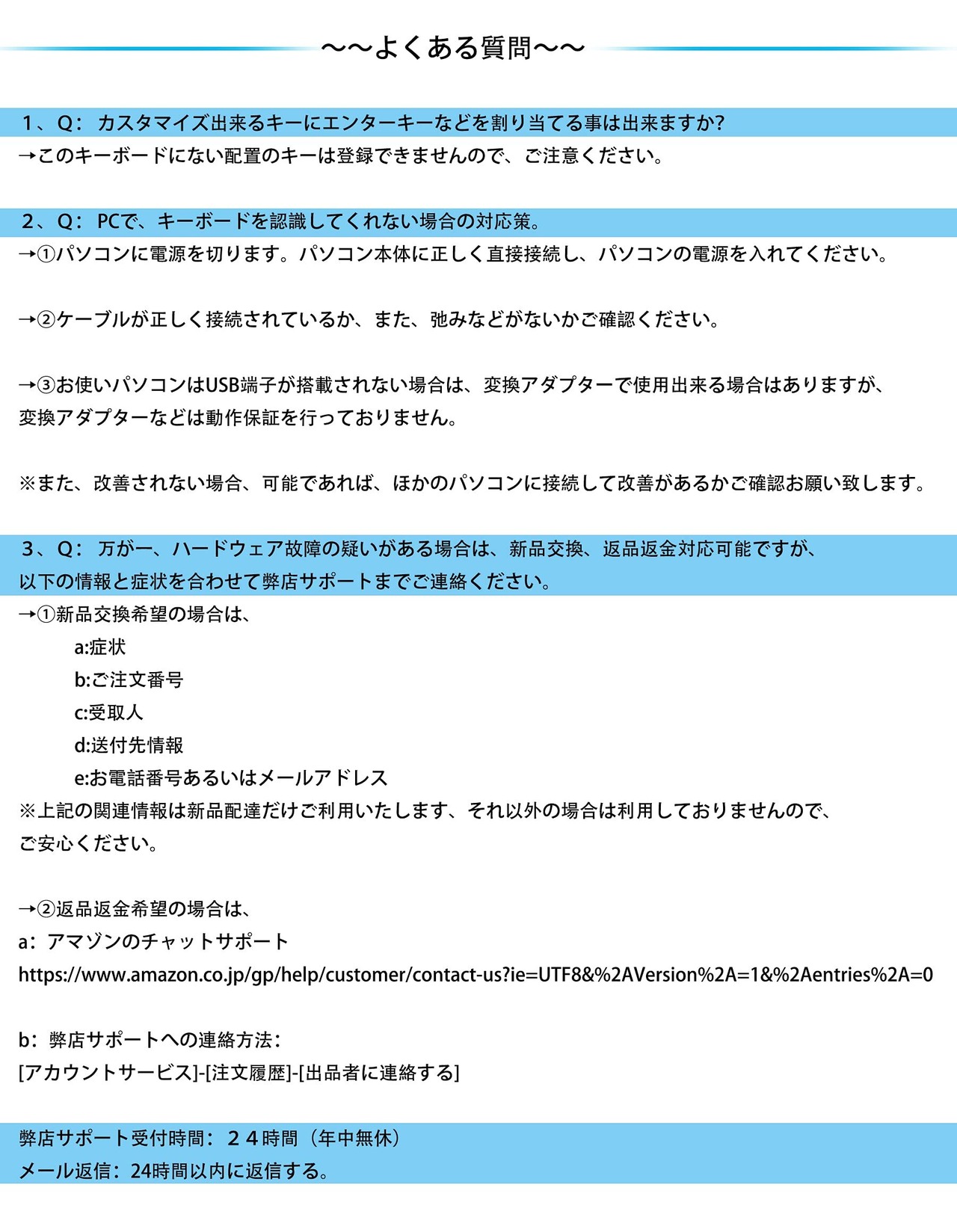 【使い方は簡単&青軸】―――有線キーボードです。PCに挿入したら、すぐ使えます。ドライバーのインストールも不要で、それは自動的に認識され、使用する準備ができています。メカニカルスイッチ青軸は、打鍵感や打鍵時のキー反発力の一貫性という点でも優れています。よくある質問 Q: カスタマイズ出来るキーにエンターキーなどを割り当てる事は出来ますか? →このキーボードにない配置のキーは登録できませんので、ご注意ください。
